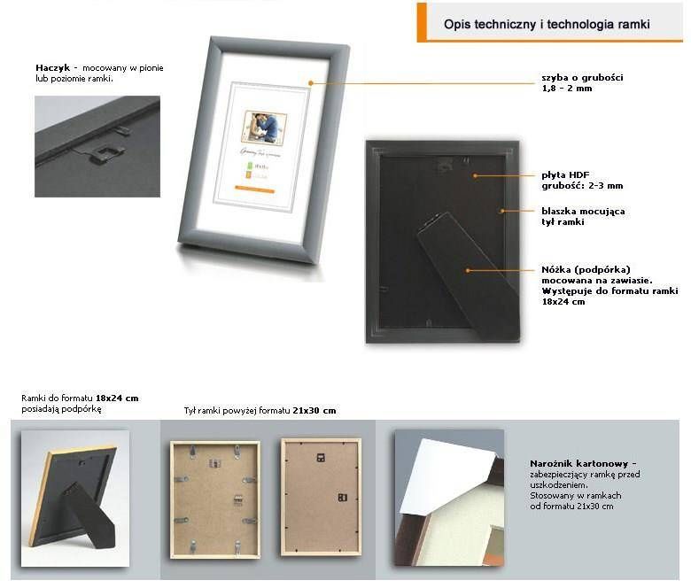 Ramka: z drewna sosnowego. Przód oprawy: szkło mineralne, o grubości 2 mm występuje do formatu 30x40 (włącznie)  / powyżej szkło organiczne 2 mm - plexi. Tył oprawy: wykonany jest z twardej płyty HDF o grubości 3 mm. Blaszki mocujące: miękkie blaszki mocujące tył ramki, zapewniają możliwość wielokrotnego otwierania. Ramka z podpórką: stopka występuje do formatu 18x24 cm umożliwia postawienie w pionie lub poziomie. Wieszak: stabilna metalowa zawieszka z możliwością ekspozycji pionowo lub poziomo. Opakowanie: ramki posiadają zabezpieczające narożniki tekturowe oraz folię ochronną. Gwarancja satysfakcji: Najwyższa jakość, gatunek I. Produkt polski.