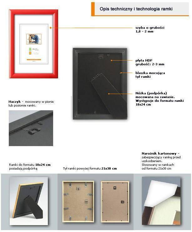 Ramka: z drewna sosnowego. Przód oprawy: szkło mineralne, o grubości 2 mm występuje do formatu 30x40 (włącznie) / powyżej szkło organiczne 2 mm - plexi. Tył oprawy: wykonany jest z twardej płyty HDF o grubości 3 mm. Blaszki mocujące: miękkie blaszki mocujące tył ramki, zapewniają możliwość wielokrotnego otwierania. Ramka z podpórką: stopka występuje do formatu 18x24 cm umożliwia postawienie w pionie lub poziomie. Wieszak: stabilna metalowa zawieszka z możliwością ekspozycji pionowo lub poziomo. Opakowanie: ramki posiadają zabezpieczające narożniki tekturowe oraz folię ochronną. Gwarancja satysfakcji: Najwyższa jakość, gatunek I. Produkt polski.