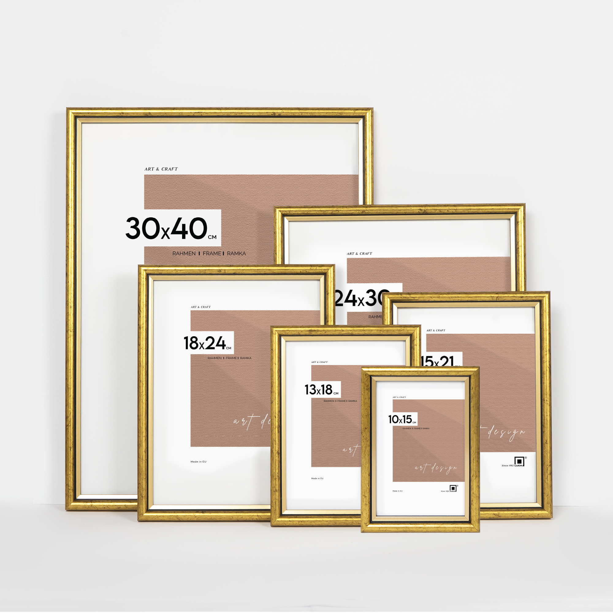 Nowoczesna foto ramka z elementami klasyki w złotym kolorze pięknie oprawi zdjęcie, dyplom lub grafikę. Odcień złota z przejściem przykuje uwagę, nada unikalności wnętrzu, w którym zostanie zawieszona lub postawiona i wzbudzi ciepłe wspomnienia. Z drugiej strony ramka wykonana jest z trwałego drewna ze świetnym spasowaniem.