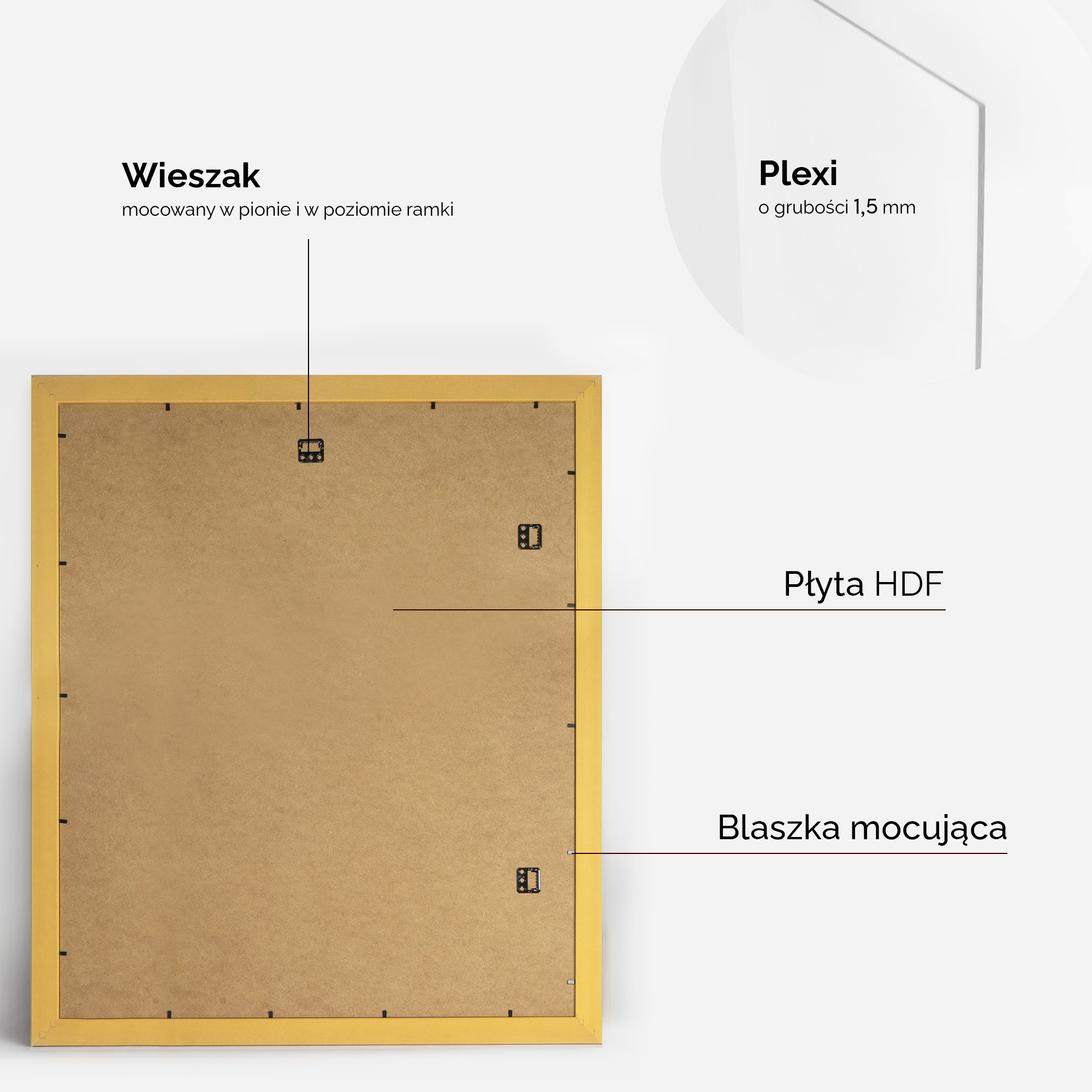 Ramka DRZG M Z w kolorze złotym, to piękna propozycja na szeroką ramkę o ciekawym połączeniu nowoczesności z klasyką. Profil ramy o szerokości 35 milimetrów i wysokości 21 milimetrów pozwoli mocno zaakcentować oprawione zdjęcie, grafikę lub plakat.