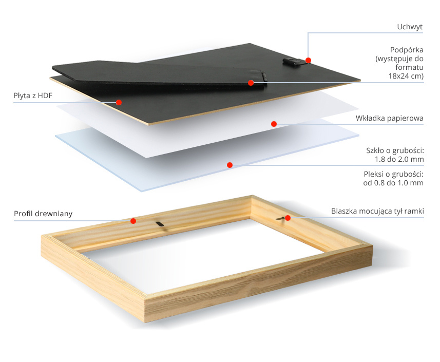 Ramka: z drewna sosnowego. Przód oprawy: szkło mineralne, o grubości 2 mm występuje do formatu 30x40 (włącznie) / powyżej szkło organiczne 2 mm - plexi. Tył oprawy: wykonany jest z twardej płyty HDF o grubości 3 mm. Blaszki mocujące: miękkie blaszki mocujące tył ramki, zapewniają możliwość wielokrotnego otwierania. Ramka z podpórką: stopka występuje do formatu 18x24 cm umożliwia postawienie w pionie lub poziomie. Wieszak: stabilna metalowa zawieszka z możliwością ekspozycji pionowo lub poziomo. Opakowanie: ramki posiadają zabezpieczające narożniki tekturowe oraz folię ochronną. Gwarancja satysfakcji: Najwyższa jakość, gatunek I. Produkt polski.