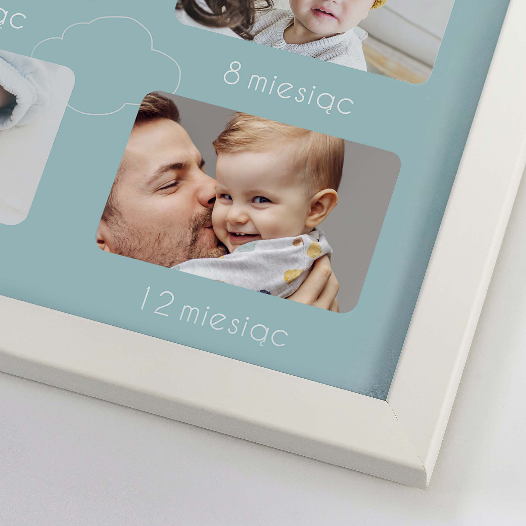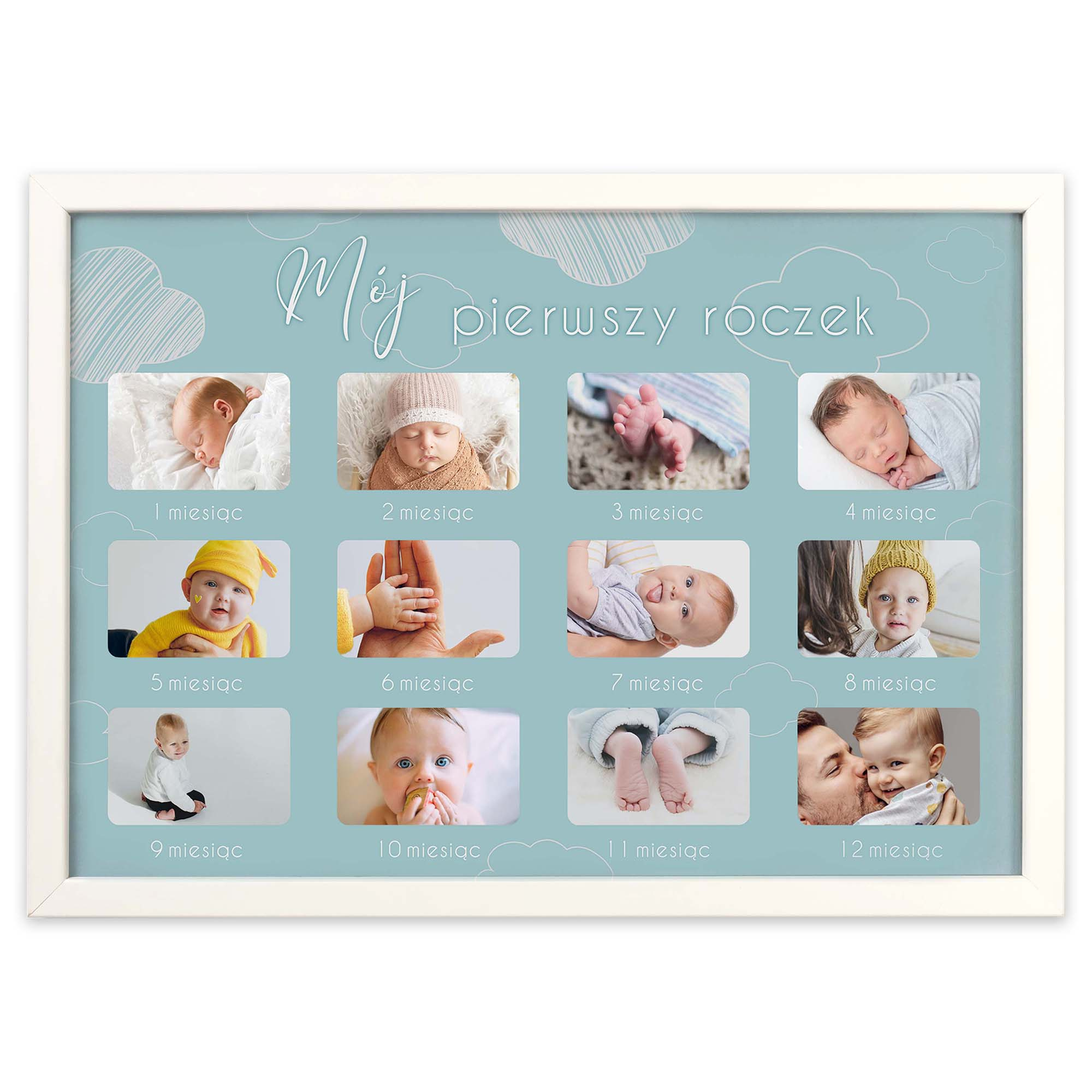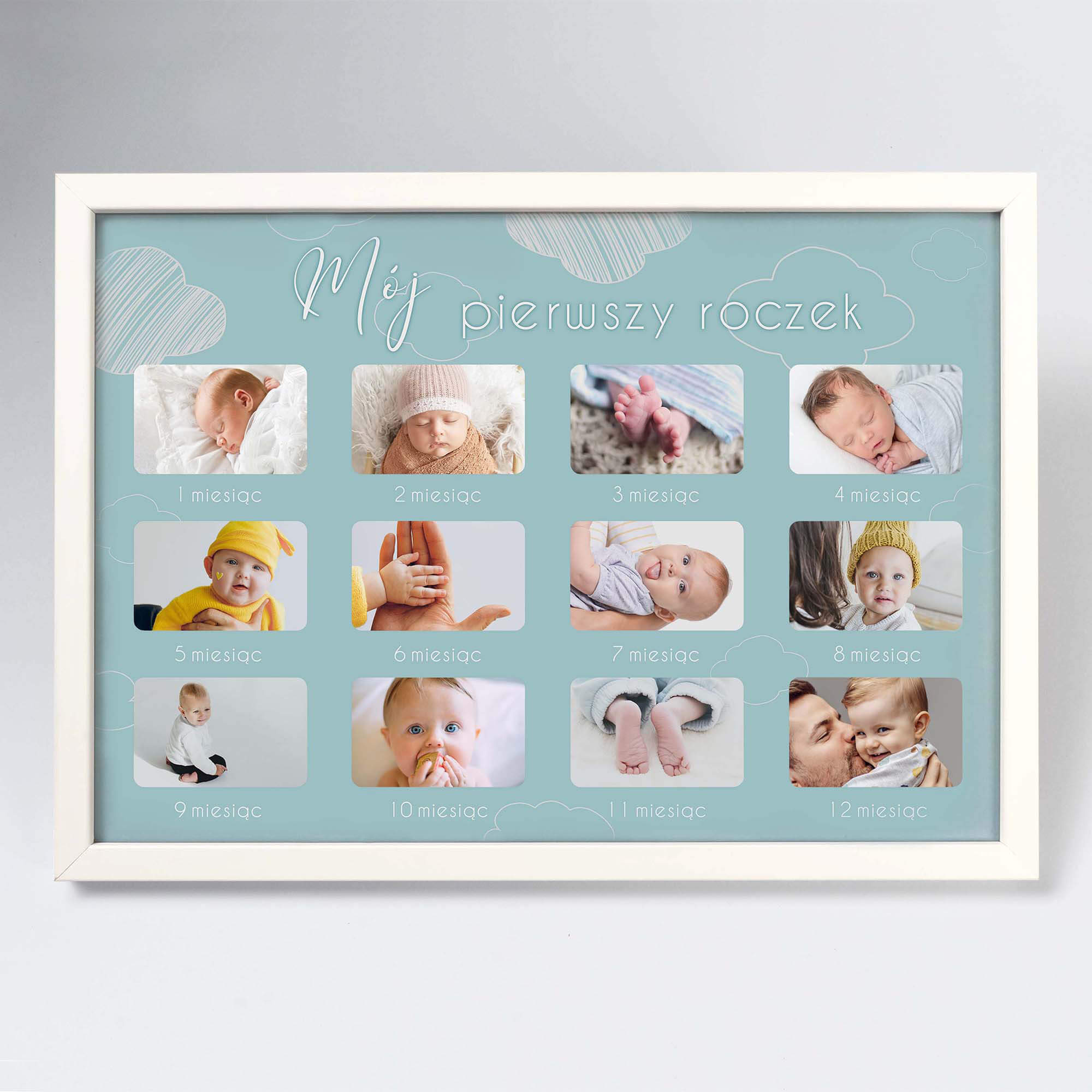Wspaniałą pamiątką będzie umieszczenie w jednym miejscu 12 zdjęć przedstawiających kolejne etapy rozwoju niemowlaka, tworząc w ten sposób piękny kalendarz z życia maluszka. Szablon dołączony do produktu dostępny jest w dwóch wersjach kolorystycznych, różowej i błękitnej.