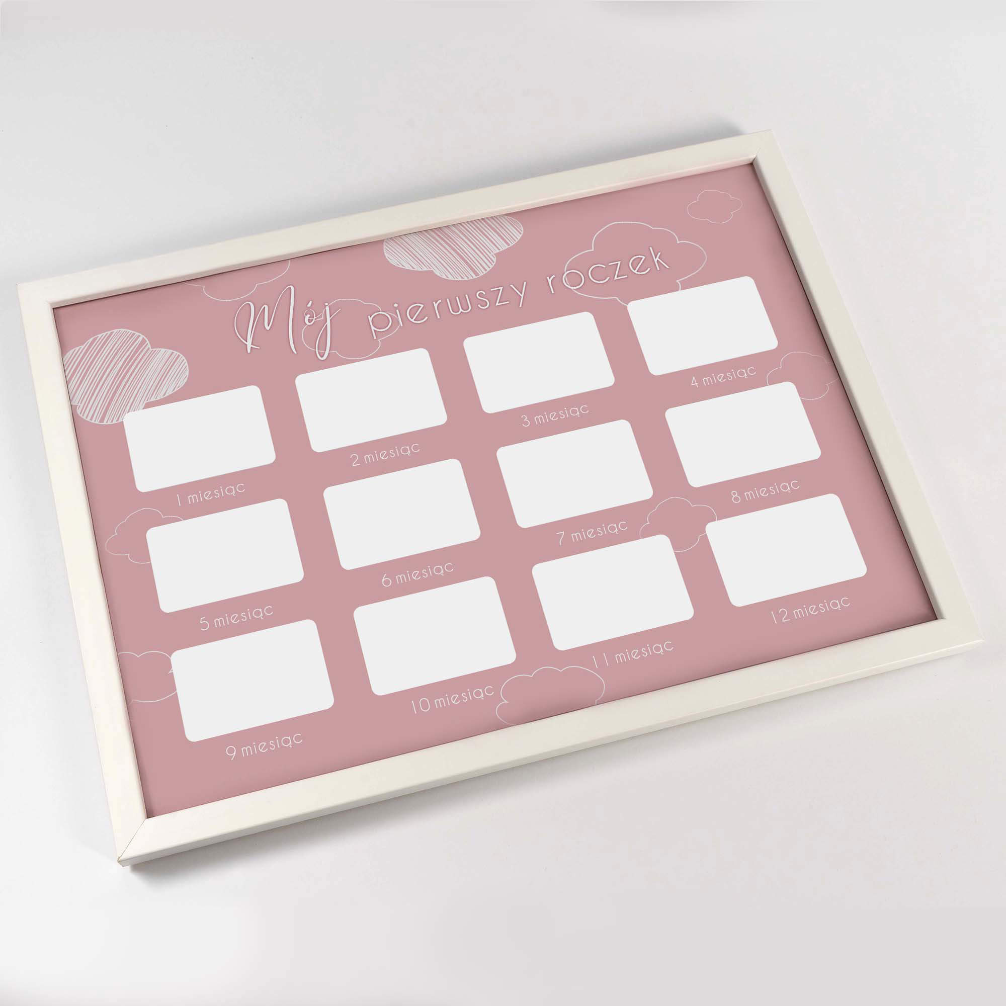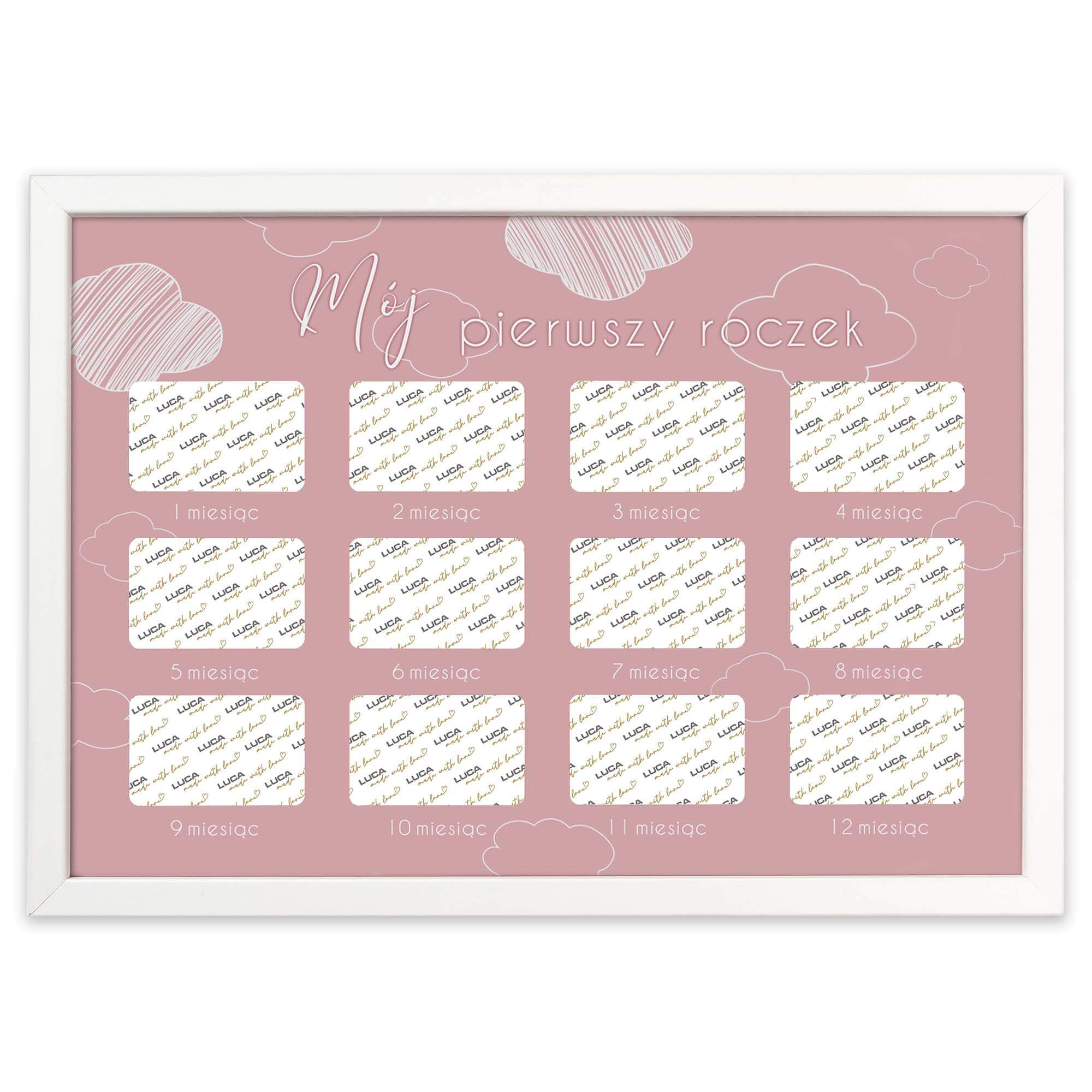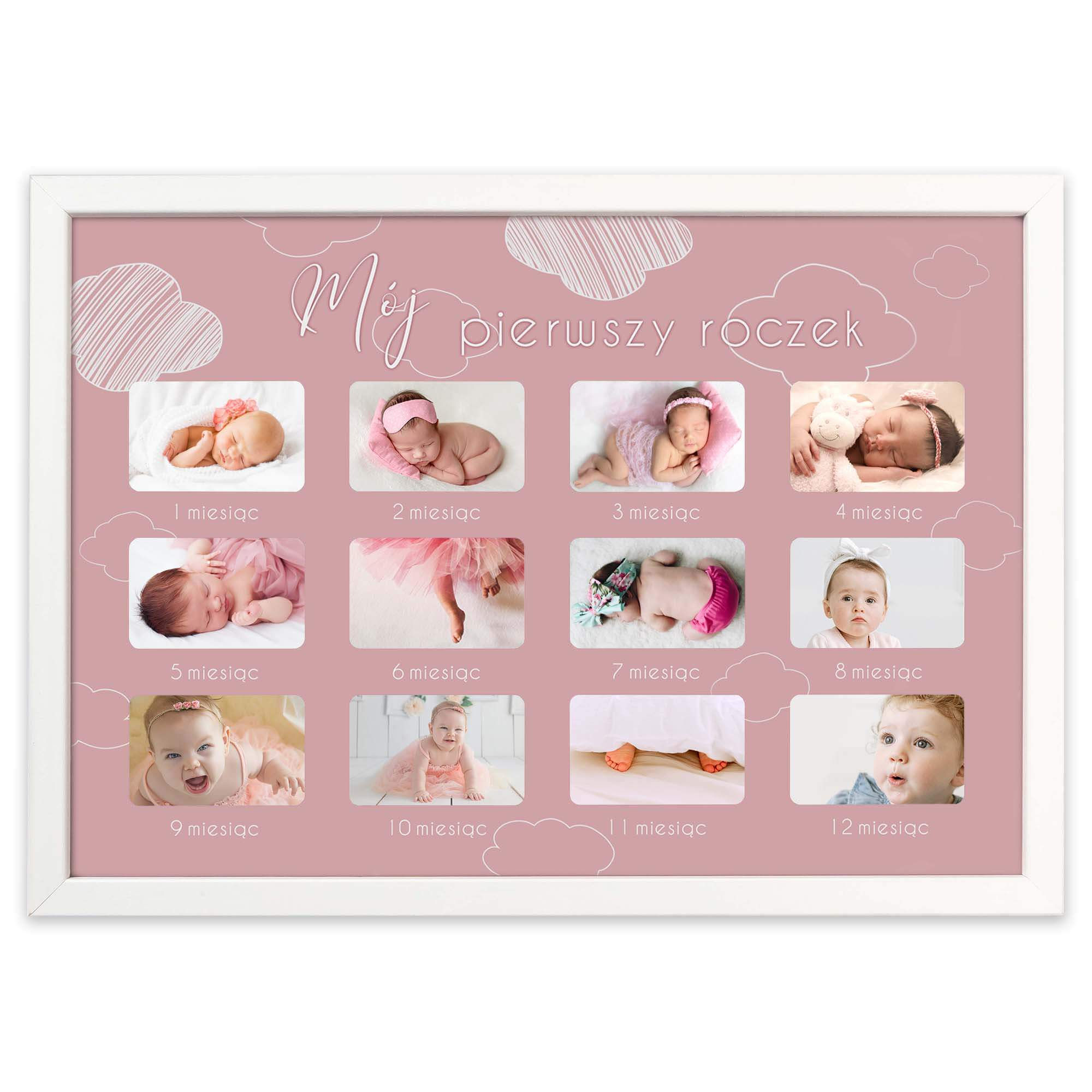 Wspaniałą pamiątką będzie umieszczenie w jednym miejscu 12 zdjęć przedstawiających kolejne etapy rozwoju niemowlaka. Szablon dołączony do produktu dostępny jest w dwóch wersjach kolorystycznych, różowej i błękitnej.