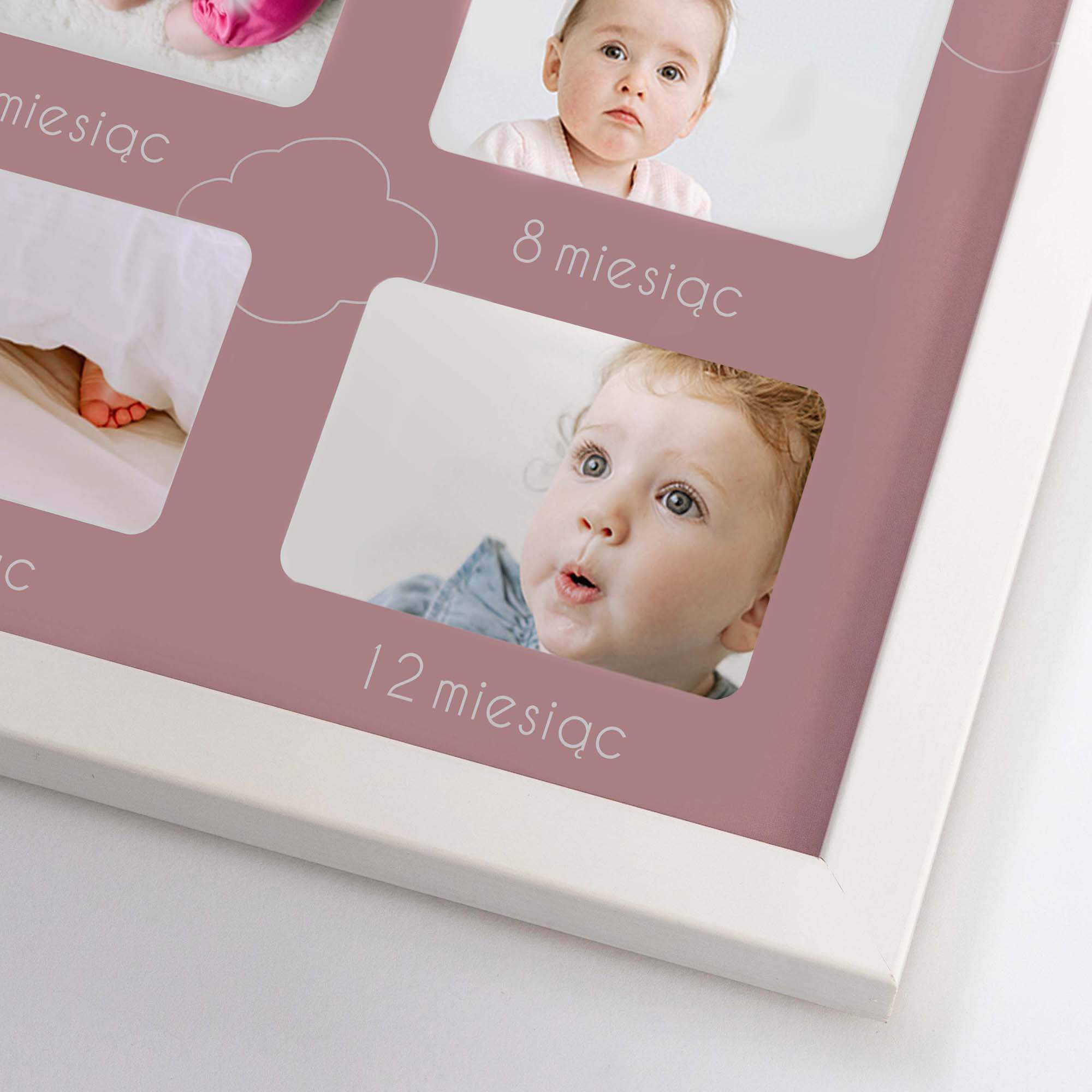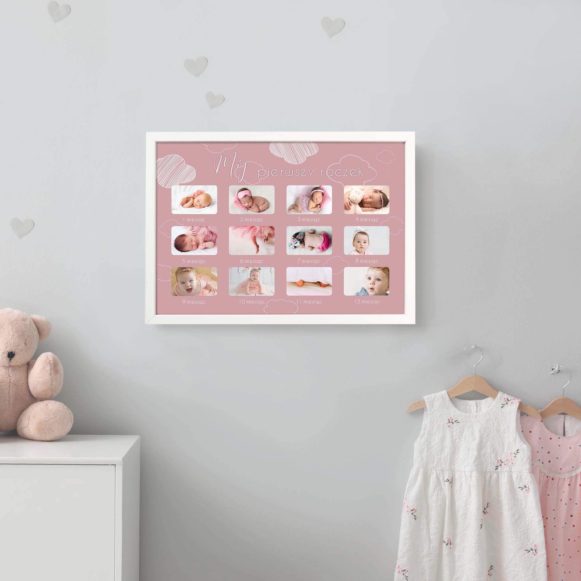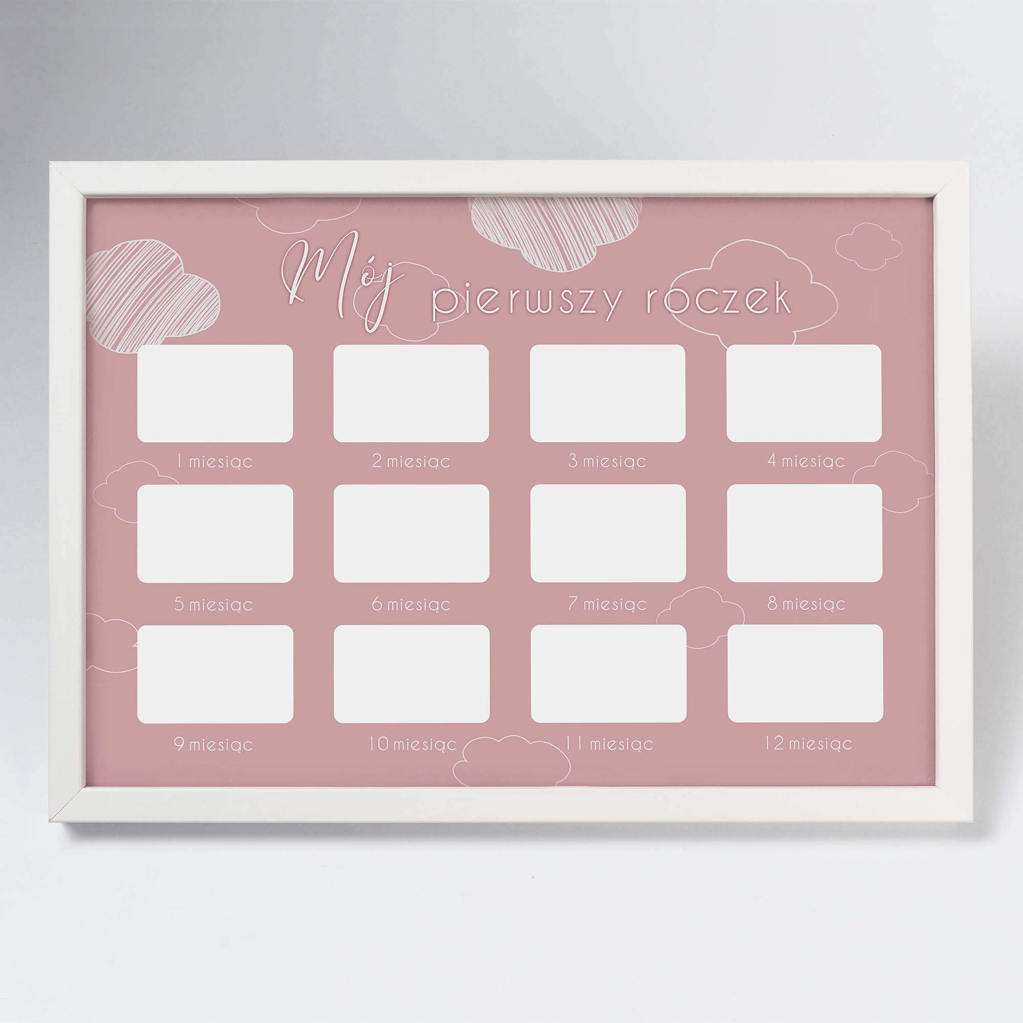Wspaniałą pamiątką będzie umieszczenie w jednym miejscu 12 zdjęć przedstawiających kolejne etapy rozwoju niemowlaka. Szablon dołączony do produktu dostępny jest w dwóch wersjach kolorystycznych, różowej i błękitnej.