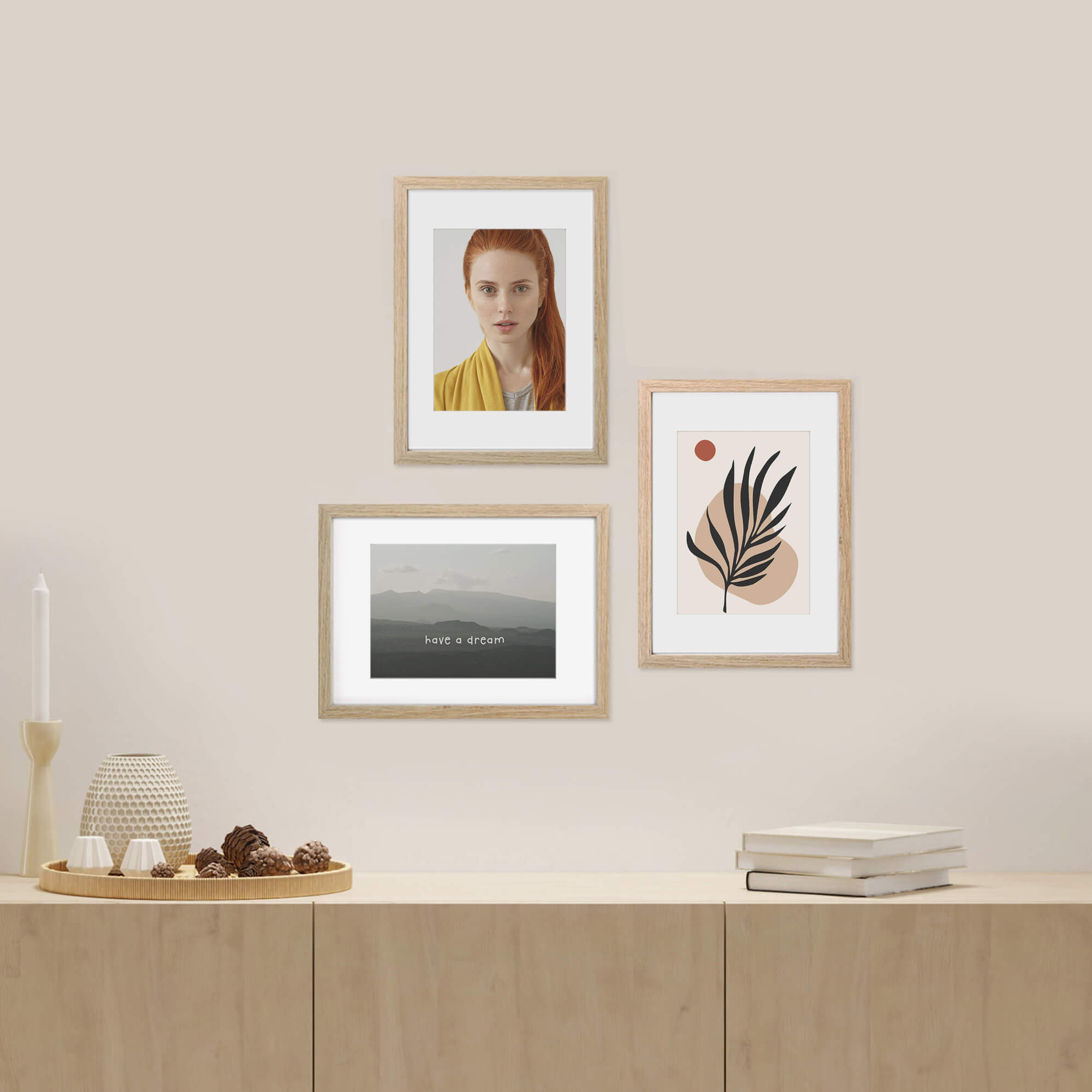 Nowoczesna ramka na zdjęcia w kolorze dębowym z jasnym passe partout o przekroju profilu 28x15 mm. Ze względu na wysoki profil nadają oprawionym pracom trójwymiarowości. Stylowo oprawisz fotografię, plakat i dyplom.