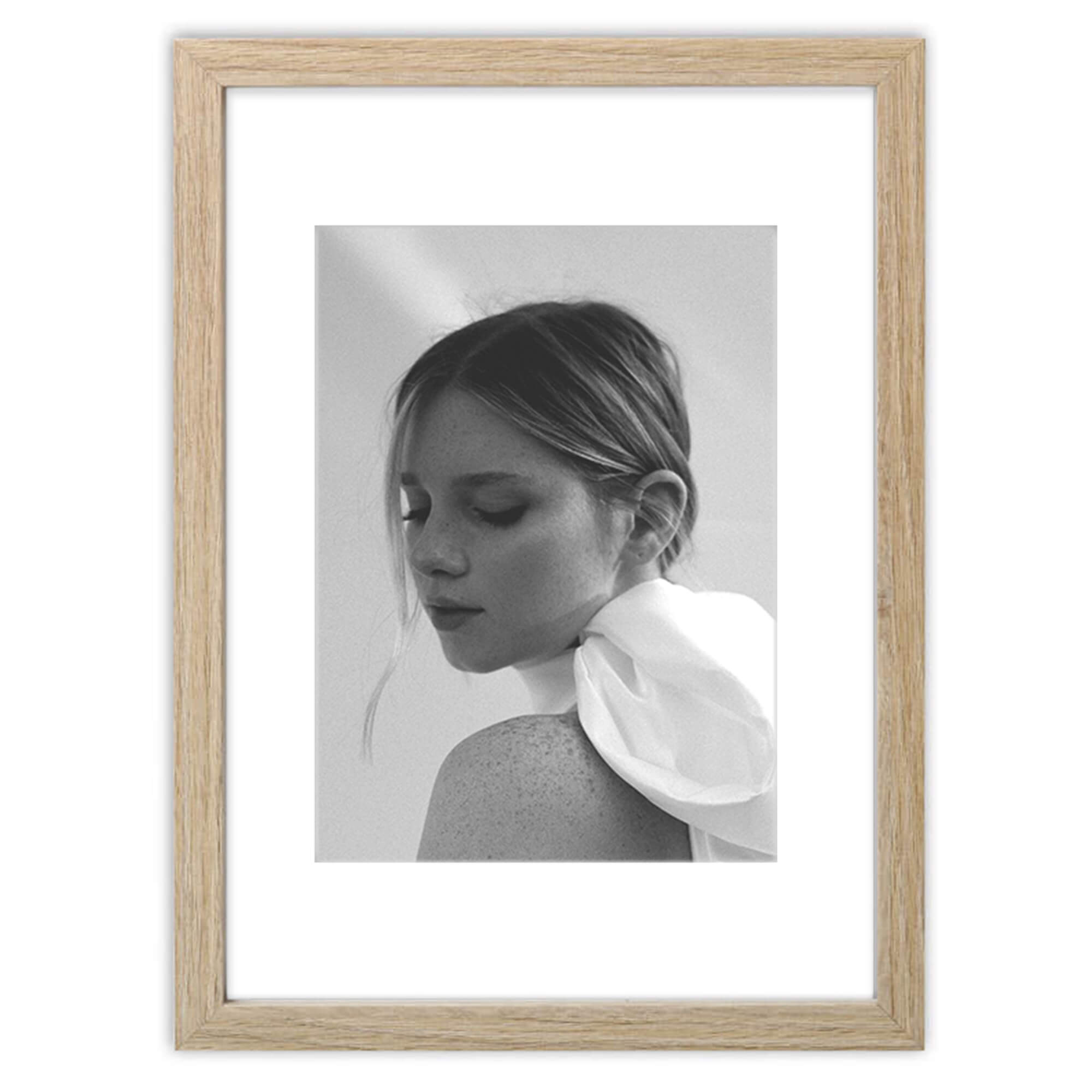 Nowoczesna  ramka na zdjęcia w kolorze dębowym z jasnym passe partout o przekroju profilu 28x15 mm. Ze względu na wysoki profil nadają oprawionym pracom trójwymiarowości. Stylowo oprawisz fotografię, plakat i dyplom.