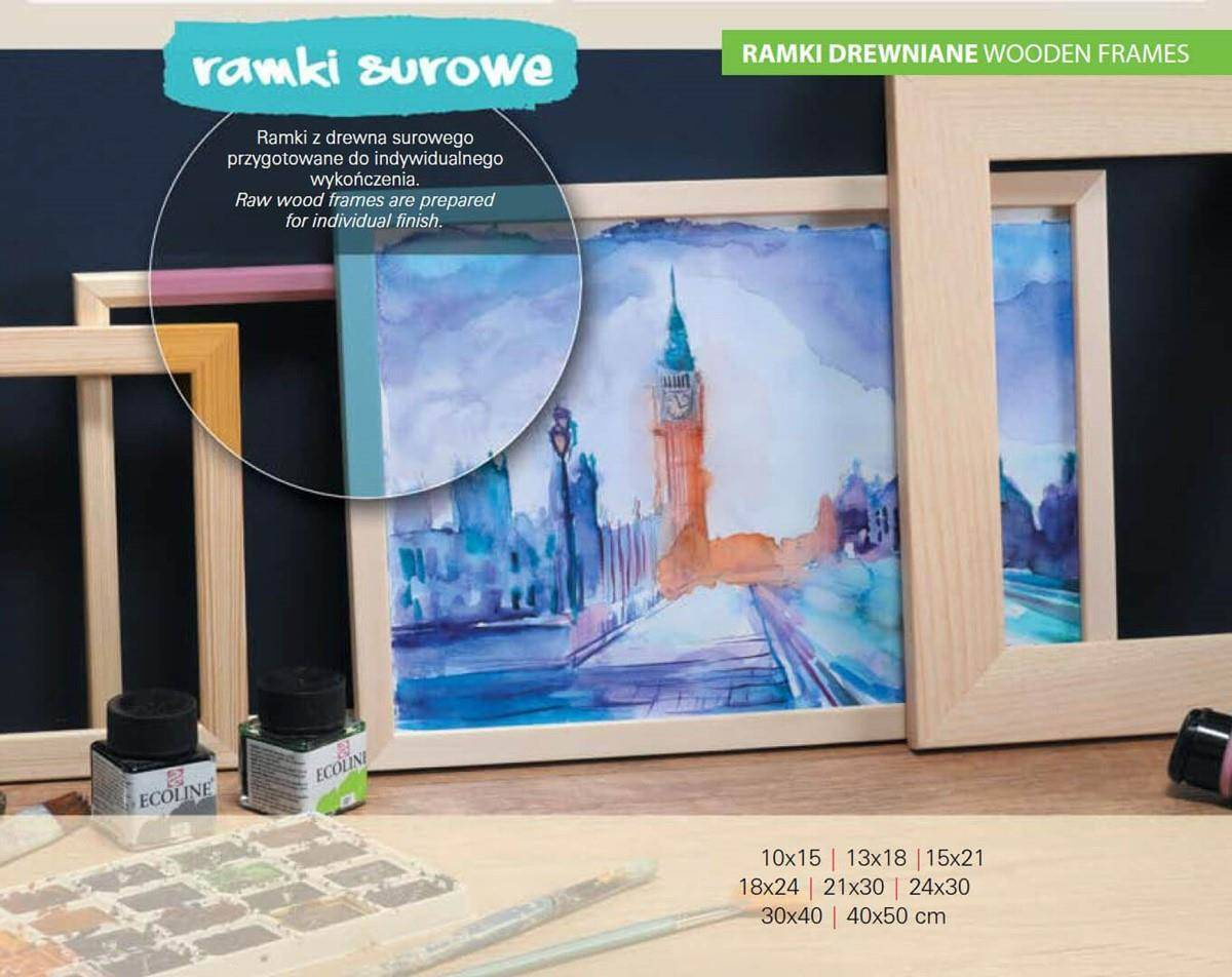 Ramka: z drewna sosnowego. Przód oprawy: szkło mineralne, o grubości 2 mm występuje do formatu 30x40 (włącznie)  / powyżej szkło organiczne 2 mm - plexi. Tył oprawy: wykonany jest z twardej płyty HDF o grubości 3 mm. Blaszki mocujące: miękkie blaszki mocujące tył ramki, zapewniają możliwość wielokrotnego otwierania. Ramka z podpórką: stopka występuje do formatu 18x24 cm umożliwia postawienie w pionie lub poziomie. Wieszak: stabilna metalowa zawieszka z możliwością ekspozycji pionowo lub poziomo. Opakowanie: ramki posiadają zabezpieczające narożniki tekturowe oraz folię ochronną. Gwarancja satysfakcji: Najwyższa jakość, gatunek I. Produkt polski.