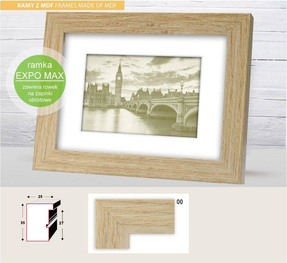Nowoczesna ramka EXPO MAX 00 w kolorze dębowym z jasnym passe partout o przekroju profilu 25x35 mm. Stylowo oprawisz fotografię, plakat i dyplom.
