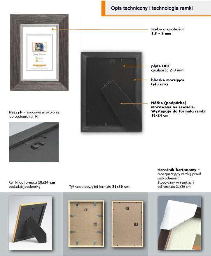 Ramka: z tworzywa. Przód oprawy: szkło mineralne, o grubości 2 mm występuje do formatu 30x40 (włącznie) / powyżej szkło organiczne 2 mm - plexi. Tył oprawy: wykonany jest z twardej płyty HDF o grubości 3 mm. Blaszki mocujące: miękkie blaszki mocujące tył ramki, zapewniają możliwość wielokrotnego otwierania. Ramka z podpórką: stopka występuje do formatu 18x24 cm umożliwia postawienie w pionie lub poziomie. Wieszak: stabilna metalowa zawieszka z możliwością ekspozycji pionowo lub poziomo. Opakowanie: ramki posiadają zabezpieczające narożniki tekturowe oraz folię ochronną. Gwarancja satysfakcji: Najwyższa jakość, gatunek I. Produkt polski.