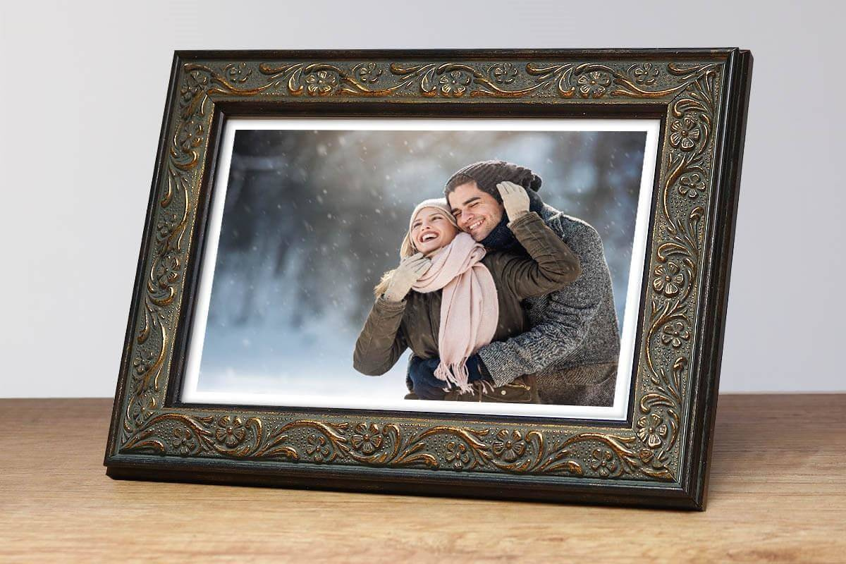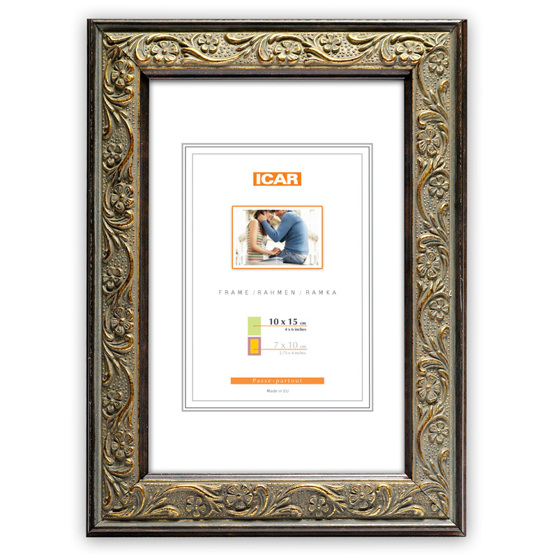 Fotoramka wykonana z tworzywa w kolorze czarno - złotym z ornamentami o przekroju profilu 22x16 mm. Przeznaczona jest do oprawy fotografii, plakatów i dyplomów. W zależności od formatu wyposażona jest w szkło mineralne lub bezbarwne szkło organiczne - wysokiej jakości plexi. Plecki wykonane są z twardej płyty HDF. Ramki na zdjęcia do rozmiaru 18x24 cm dodatkowo posiadają stopkę / nóżkę która pozwala eksponować oprawiony obraz na biurku lub regale. Ramka plastikowa MIX S 5 dostępna jest w rozmiarach od 10x15 cm do 50x70 cm.