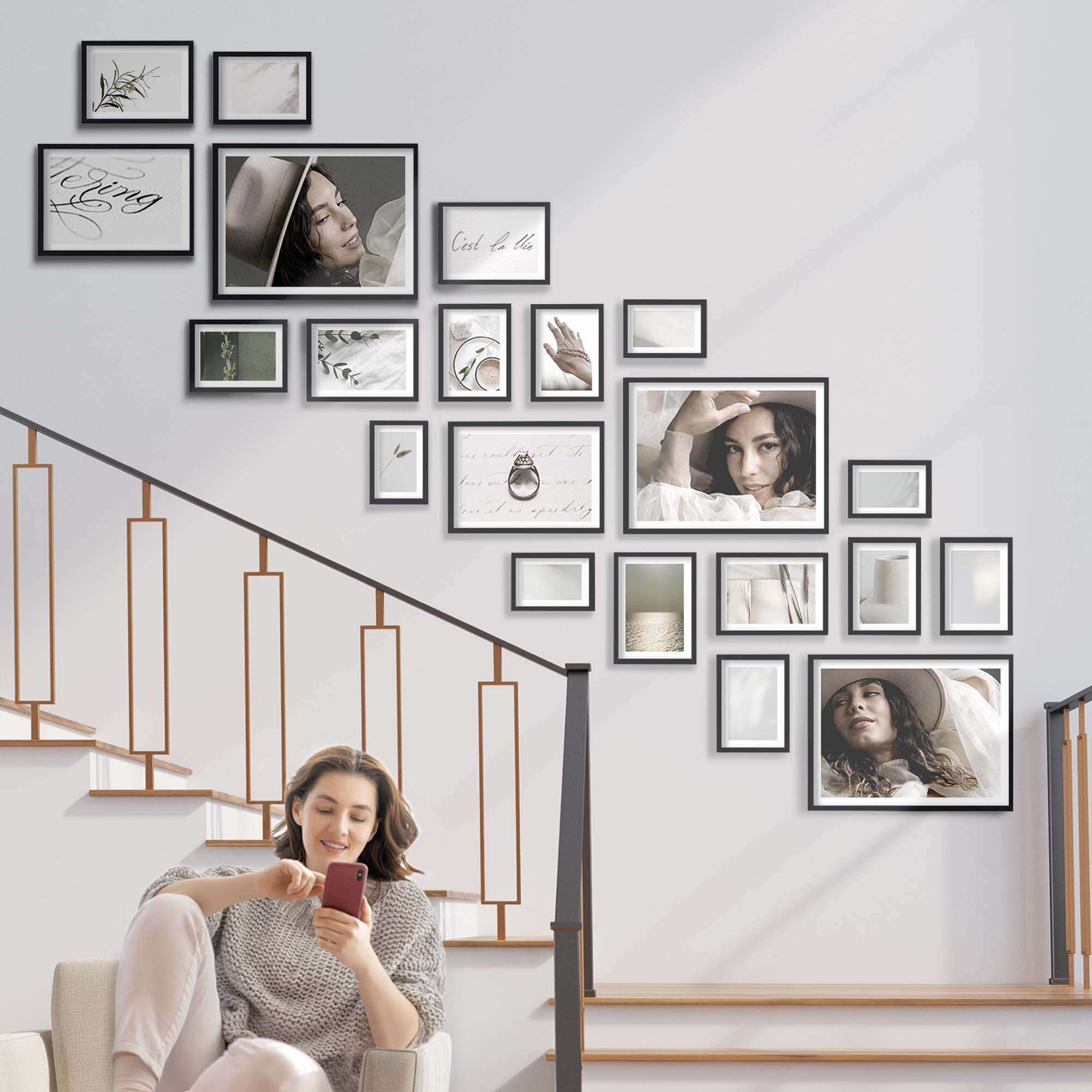 Nasze autorskie galerie ścienne DIY Gallery FrameTM zostały zaprojektowane we współpracy z artystami i grafikami. Możesz zaprezentować w nich Twoje ulubione zdjęcia, rysunki jak i grafiki. W zestawie znajdziesz wszystkie potrzebne elementy takie jak ramki, szablon w skali 1:1 na ścianę, komplet montażowy z wkrętami oraz intuicyjną instrukcję!