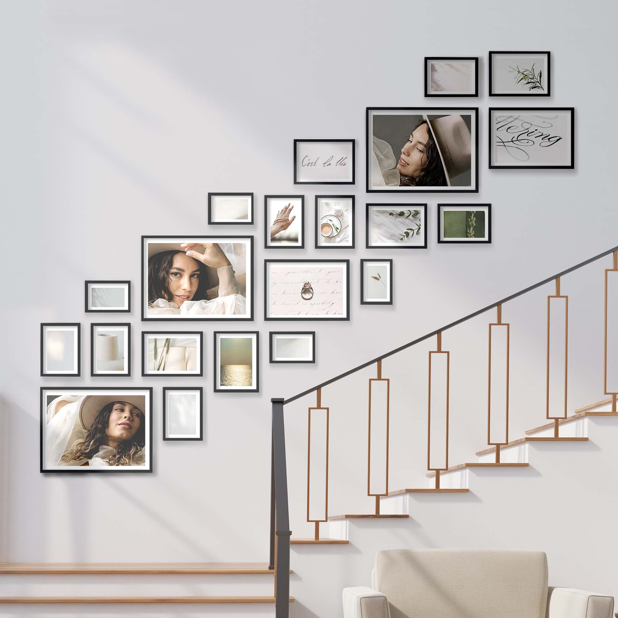 Nowoczesne galerie ścienne to prosty i efektowny sposób na aranżację ściany przy schodach. Dekoracyjny produkt pozwala stworzyć niebanalną kompozycję składającą się z 21 sztuk ramek. Wszystkie ramki zostały wykonane w 100% z drewna wysokiej jakości, dzięki czemu są trwałe i solidne.