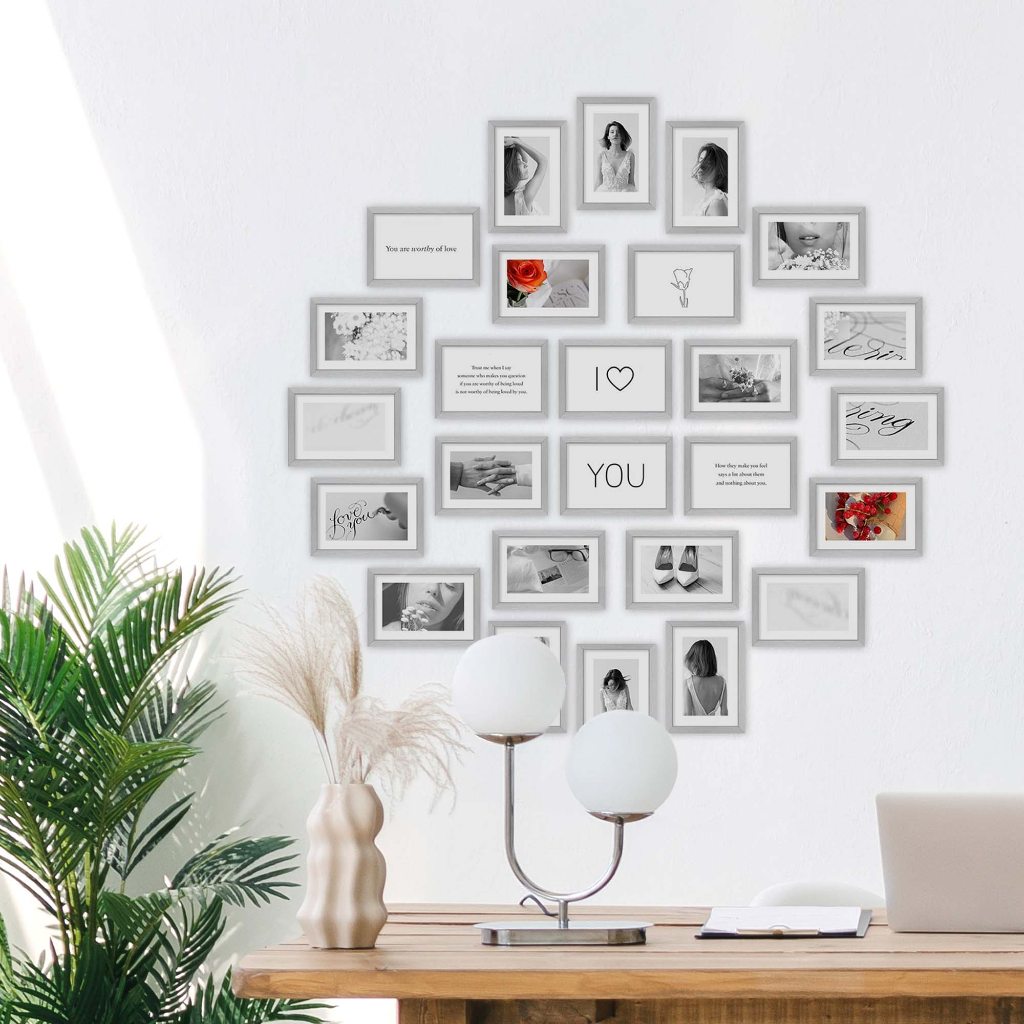 Nowoczesne galerie ścienne to prosty i efektowny sposób na aranżację każdego wnętrza. Dekoracyjny produkt pozwala stworzyć niebanalną kompozycję składającą się z 26 sztuk ramek. Wszystkie ramki zostały wykonane w 100% z drewna wysokiej jakości, dzięki czemu są trwałe i solidne.
