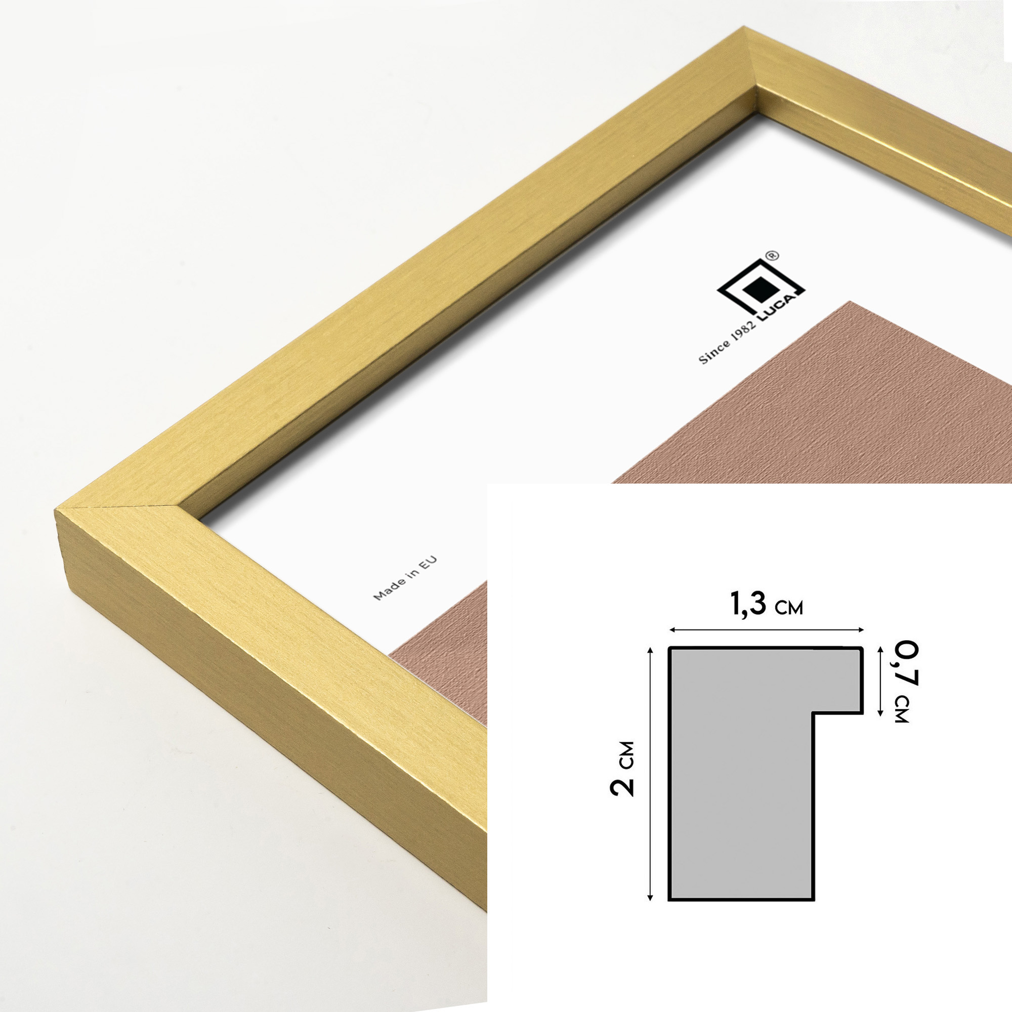 Ramka precyzyjnie wykonana z EKO MDF w kolorze złotym. Modna stylistyka i delikatna rama o szerokości 15 mm i wysokości 20 mm przykuje uwagę i pozwoli zaakcentować oprawione zdjęcie, plakat lub dyplom.