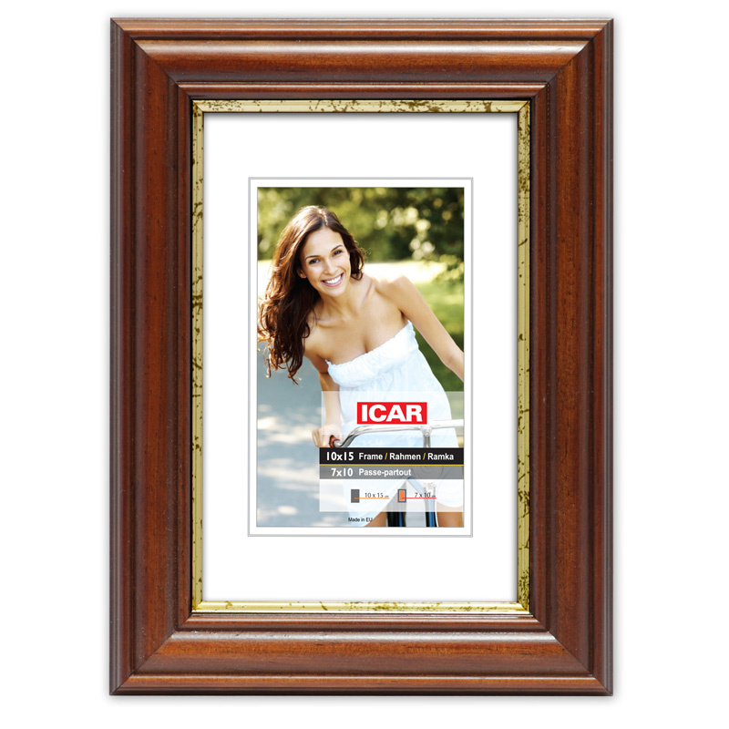 Klasyczna fotoramka w kolorze brązowym ze złotym paskiem, z widoczną strukturą drewna o przekroju profilu 27x15 mm wykonana w 100% z drewna. Przeznaczona jest do oprawy fotografii, plakatów i dyplomów. W zależności od formatu wyposażona jest w szkło mineralne lub bezbarwne szkło organiczne - wysokiej jakości plexi. Plecki wykonane są z twardej płyty HDF. Ramki na zdjęcia do rozmiaru 18x24 cm dodatkowo posiadają stopkę / nóżkę która pozwala eksponować oprawiony obraz na biurku lub regale. Ramka drewniana DRL F 3 dostępna jest w rozmiarach od 10x15 cm do 50x70 cm.