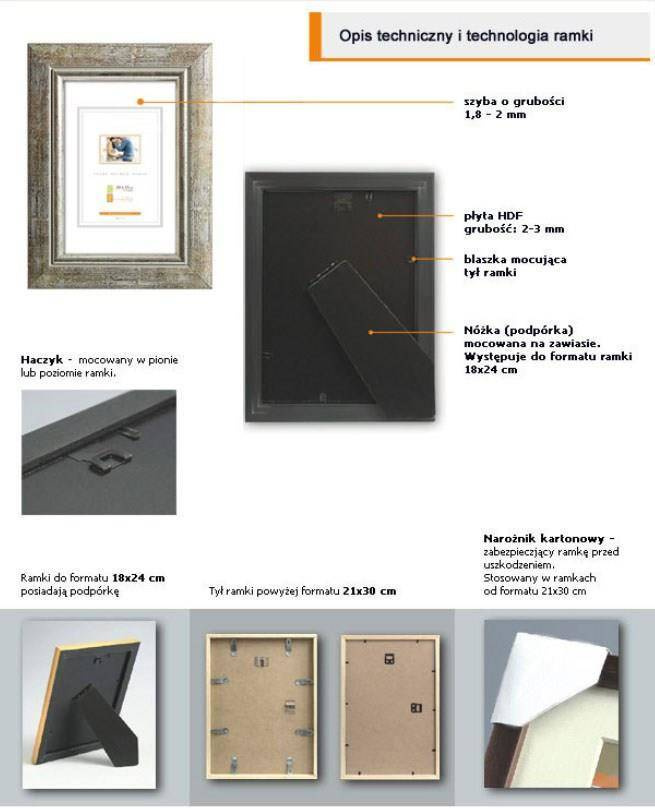 Ramka: z drewna sosnowego. Przód oprawy: szkło mineralne, o grubości 2 mm występuje do formatu 30x40 (włącznie)  / powyżej szkło organiczne 2 mm - plexi. Tył oprawy: wykonany jest z twardej płyty HDF o grubości 3 mm. Blaszki mocujące: miękkie blaszki mocujące tył ramki, zapewniają możliwość wielokrotnego otwierania. Ramka z podpórką: stopka występuje do formatu 18x24 cm umożliwia postawienie w pionie lub poziomie. Wieszak: stabilna metalowa zawieszka z możliwością ekspozycji pionowo lub poziomo. Opakowanie: ramki posiadają zabezpieczające narożniki tekturowe oraz folię ochronną. Gwarancja satysfakcji: Najwyższa jakość, gatunek I. Produkt polski.