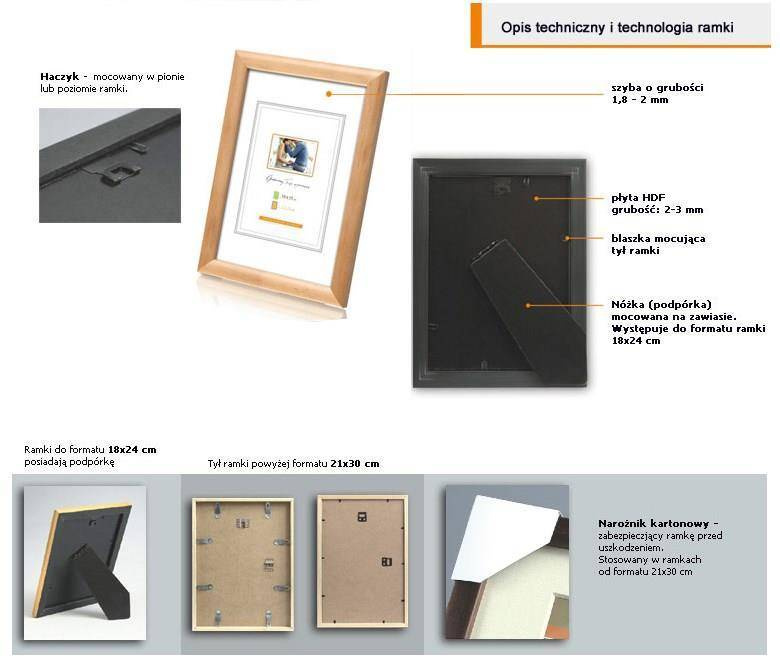 - Blaszki mocujące: miękkie blaszki mocujące tył ramki, zapewniają możliwość wielokrotnego otwierania