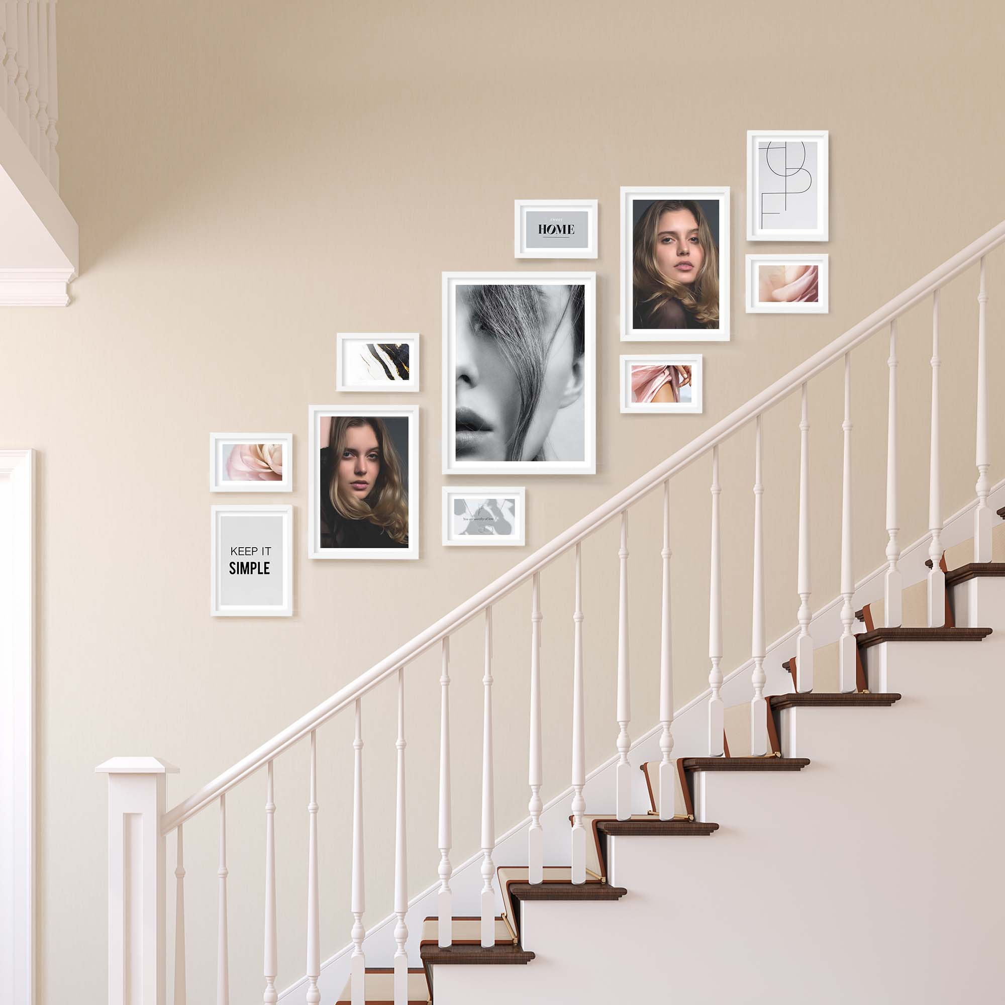 Nowoczesne galerie ścienne to prosty i efektowny sposób na aranżację ściany przy schodach. Dekoracyjny produkt pozwala stworzyć niebanalną kompozycję składającą się z 11 sztuk ramek. Wszystkie ramki zostały wykonane w 100% z drewna wysokiej jakości, dzięki czemu są trwałe i solidne.