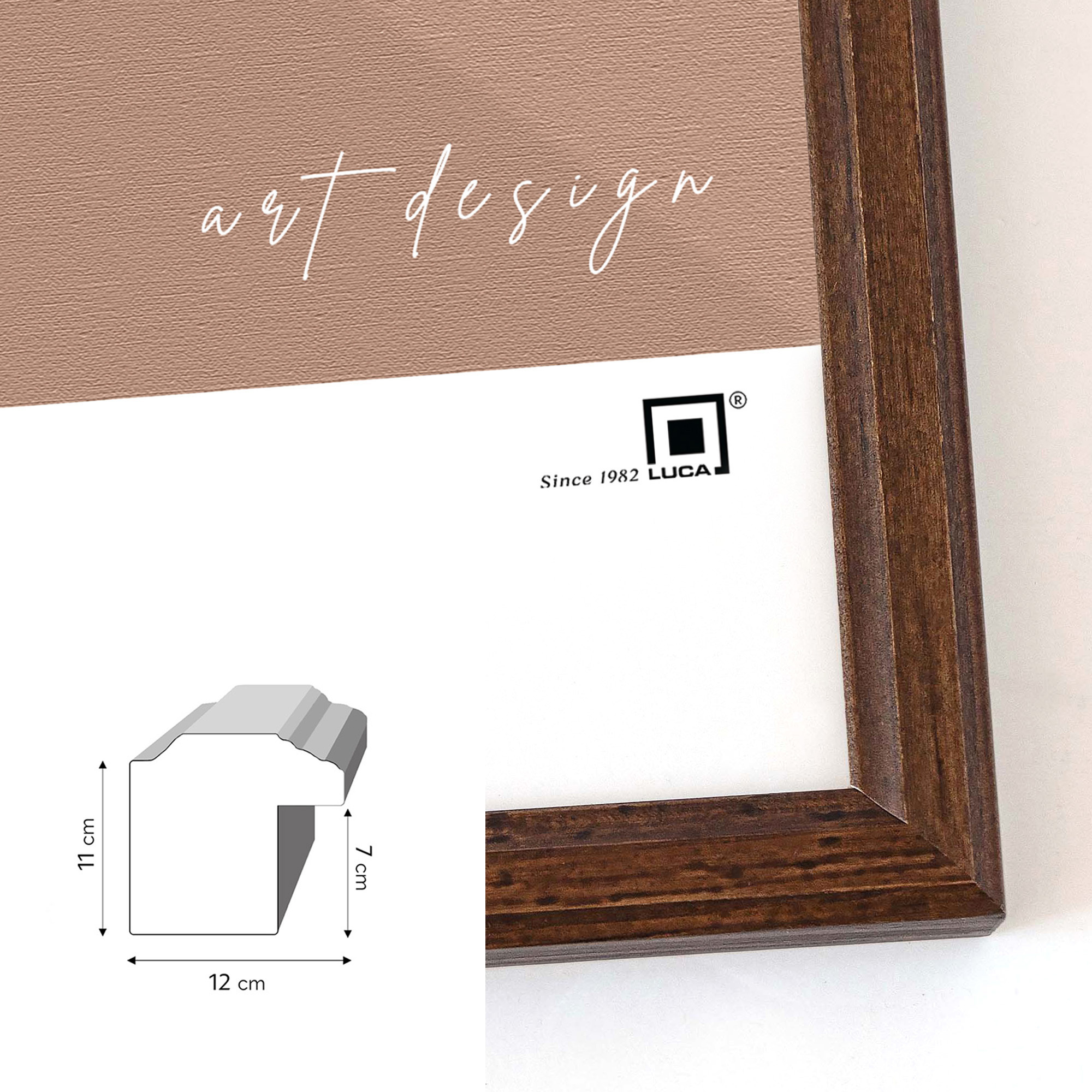 Galeria GF0003 w kolorze brązowym została stworzona z ramek PRESTO 4, które charakteryzują się wysoką jakością i trwałością. Przy tworzeniu ich użyto wysokiej jakości drewna i trwałych zszywek "V-nail" przy łączeniach. Profil ramek to 12 mm szerokości i 11 mm wysokości. Miękkie blaszki mocujące tył ramki zapewniają możliwość wielokrotnego otwierania.