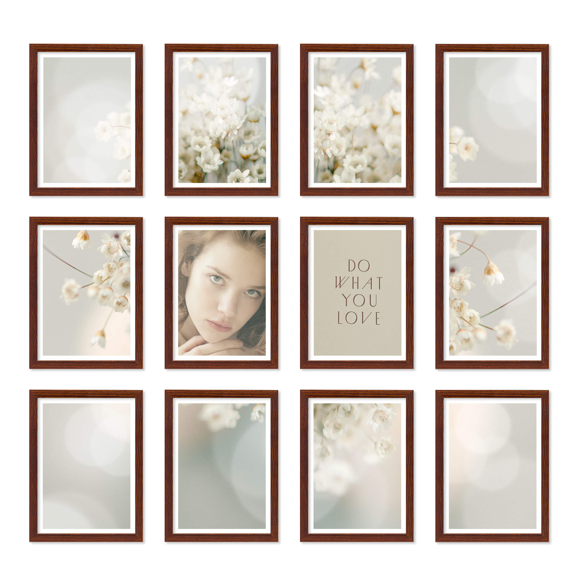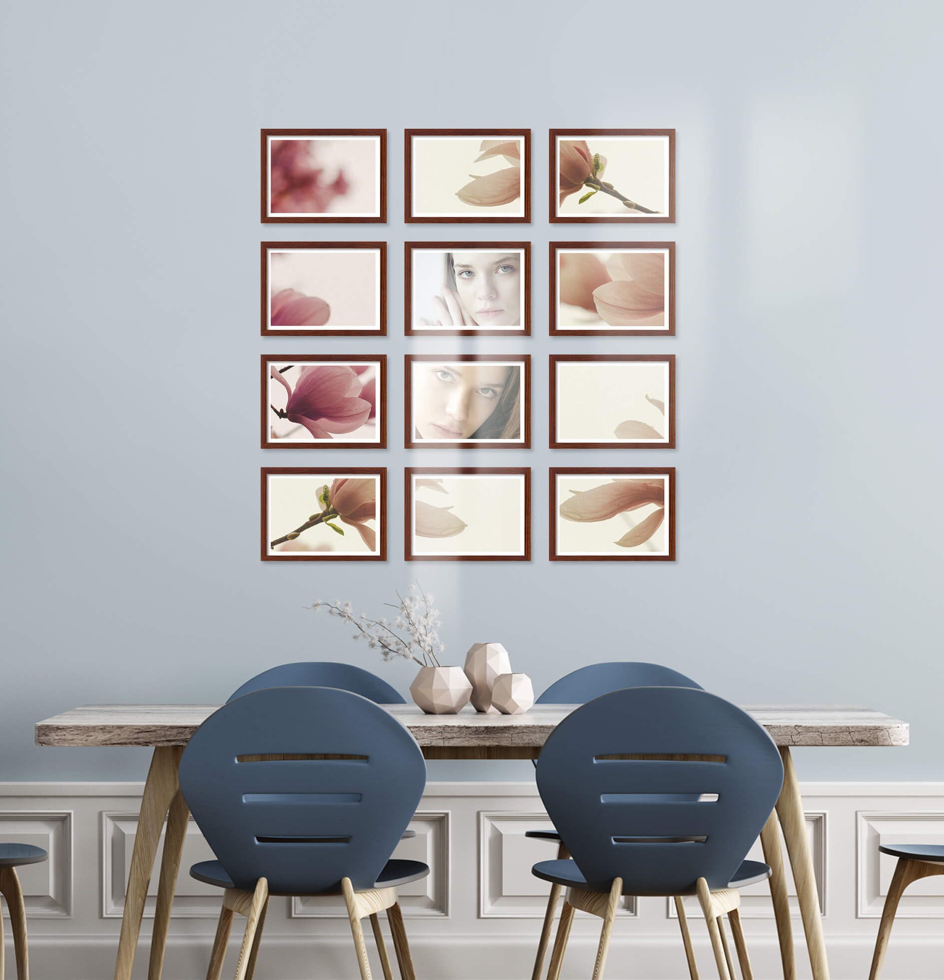 Nowoczesne galerie ścienne to prosty i efektowny sposób na aranżację każdego wnętrza. Dekoracyjny produkt pozwala stworzyć niebanalną kompozycję składającą się z 12 sztuk ramek. Wszystkie ramki zostały wykonane w 100% z drewna wysokiej jakości, dzięki czemu są trwałe i solidne.