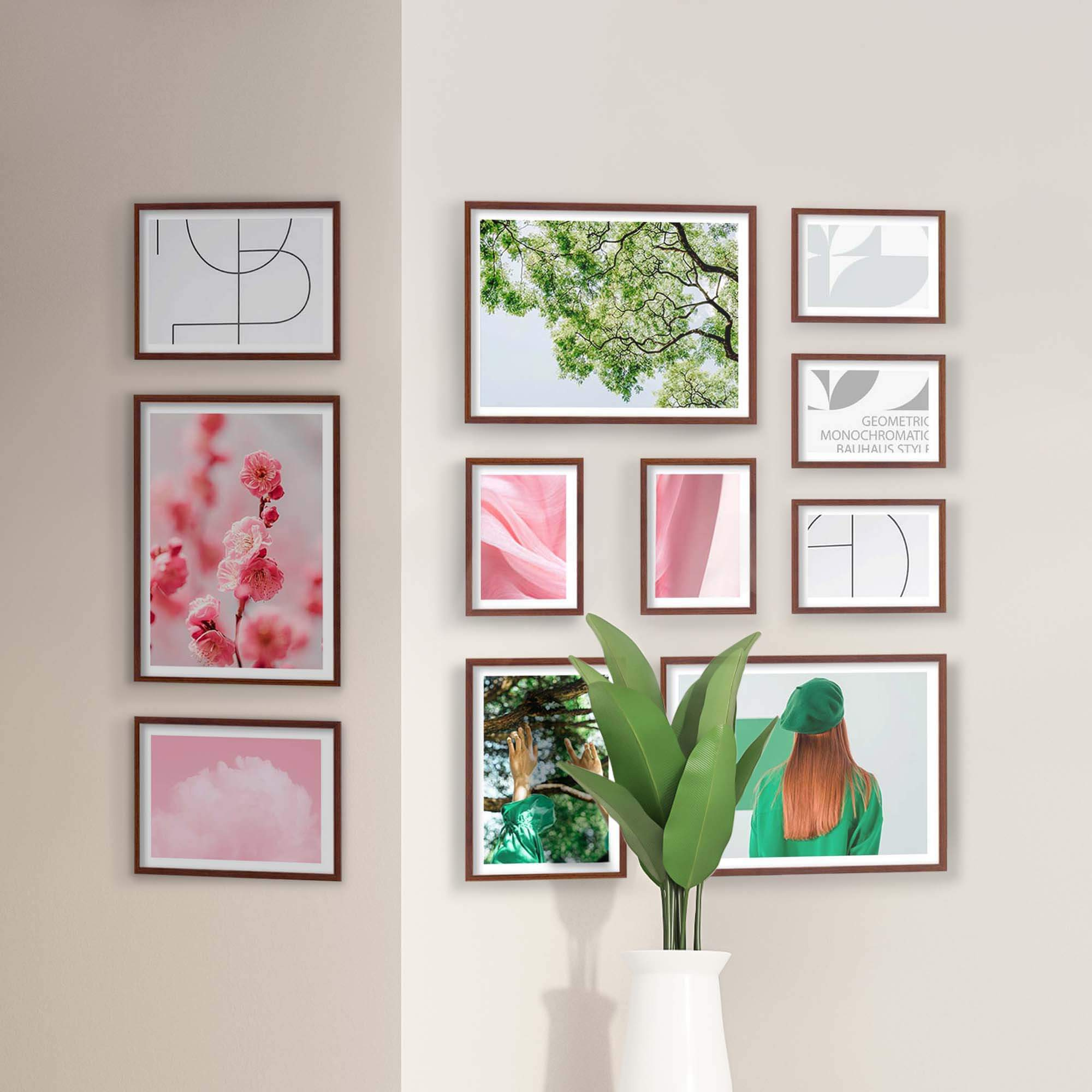 Nowoczesne galerie ścienne to prosty i efektowny sposób na aranżację każdego wnętrza. Dekoracyjny produkt pozwala stworzyć niebanalną kompozycję składającą się z 11 sztuk ramek. Wszystkie ramki zostały wykonane w 100% z drewna wysokiej jakości, dzięki czemu są trwałe i solidne.