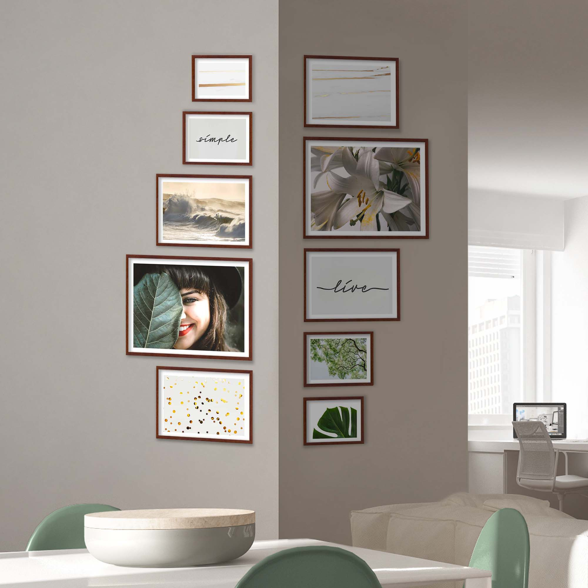 Nowoczesna galeria ścienna PINIA 3 GF0039 składająca się z trwałych, wysokiej jakości ramek wykonanych całkowicie ze starannie dobranego polskiego drewna. Tak w 100% z litego drewna! - nie jest to drewnopochodny MDF prasowany z lepikami wiór oklejany papierem. Ambitny, profilowany kształt przekroju ramki nadaje mu lekkości i elegancji. Profil drewniany o przekroju 11x14 mm jest bardzo stabilny, a zastosowane do połączenia zszywki typu „V-nail” gwarantują doskonale spasowane narożniki co sprawia, że oprawione pamiątki będą cieszyły oko przez długi czas. Ramki w zastawie z kolekcji PINIA 3 GF0039 charakteryzują się subtelnym wyglądem i szerokim wachlarzem kształtów od prostych mini galerii do rozbudowanych zestawów. Dostępne są w wielu wersjach kolorystycznych od neutralnej białej, zawsze eleganckiej czerni, ciepłego naturalnego drewna i uniwersalnego brązu.Zawartość zestawu
