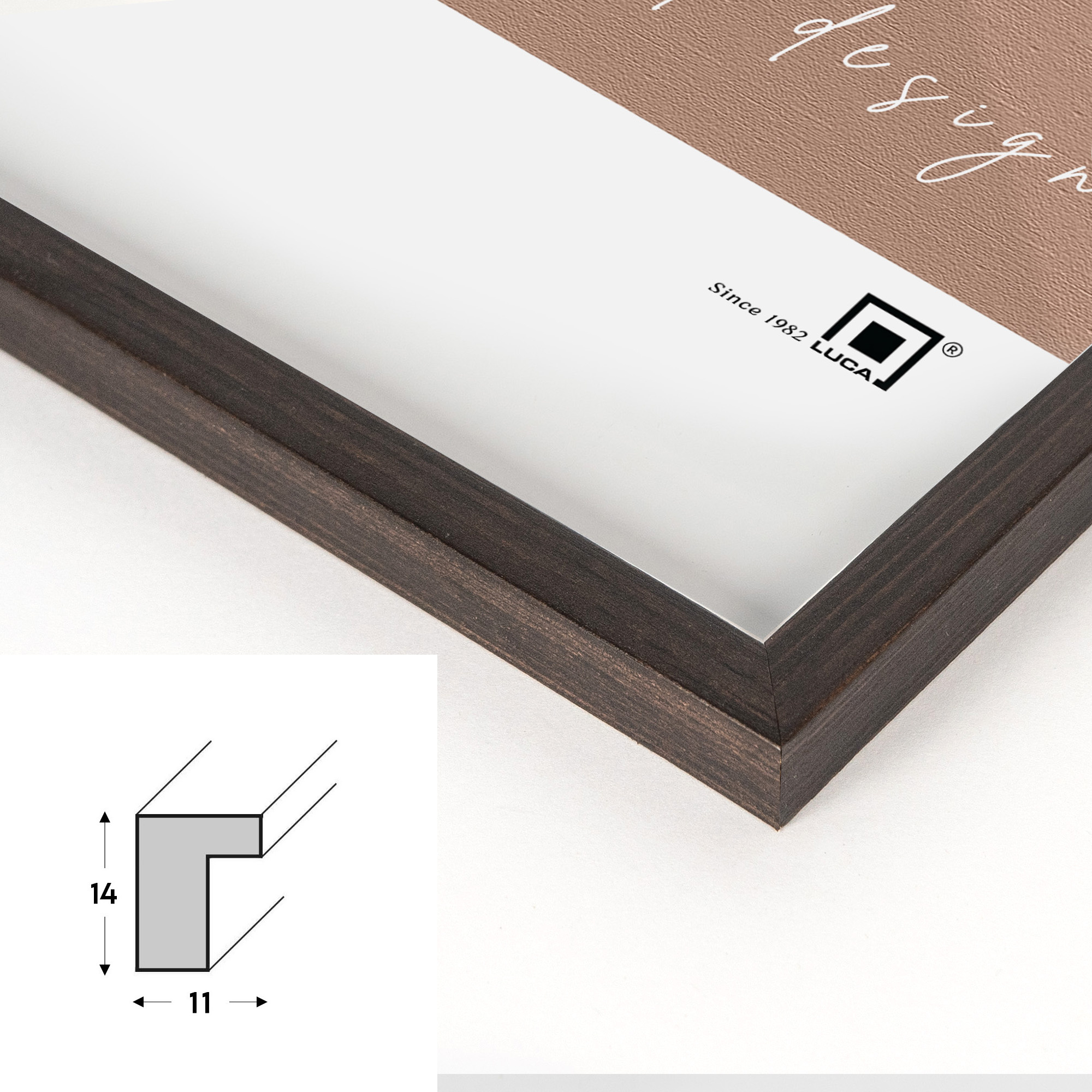 Galeria GF0003 w kolorze ciemno brązowym została stworzona z ramek PINIA 4, które charakteryzują się wysoką jakością i trwałością. Przy tworzeniu ich użyto wysokiej jakości drewna i trwałych zszywek "V-nail" przy łączeniach. Profil ramek to 11 mm szerokości i 14 mm wysokości. Miękkie blaszki mocujące tył ramki zapewniają możliwość wielokrotnego otwierania.