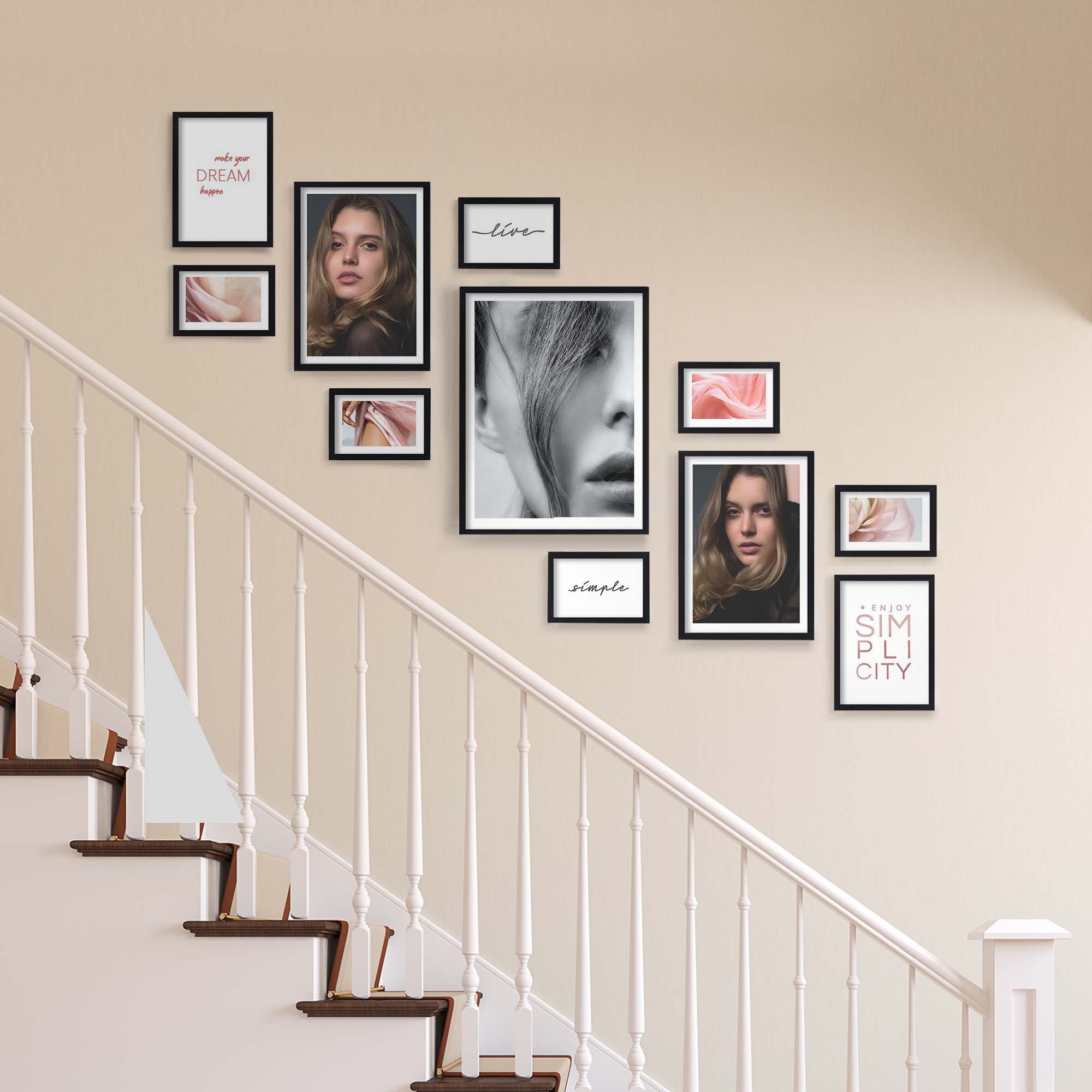 Nowoczesne galerie ścienne to prosty i efektowny sposób na aranżację ściany przy schodach. Dekoracyjny produkt pozwala stworzyć niebanalną kompozycję składającą się z 11 sztuk ramek. Wszystkie ramki zostały wykonane w 100% z drewna wysokiej jakości, dzięki czemu są trwałe i solidne.