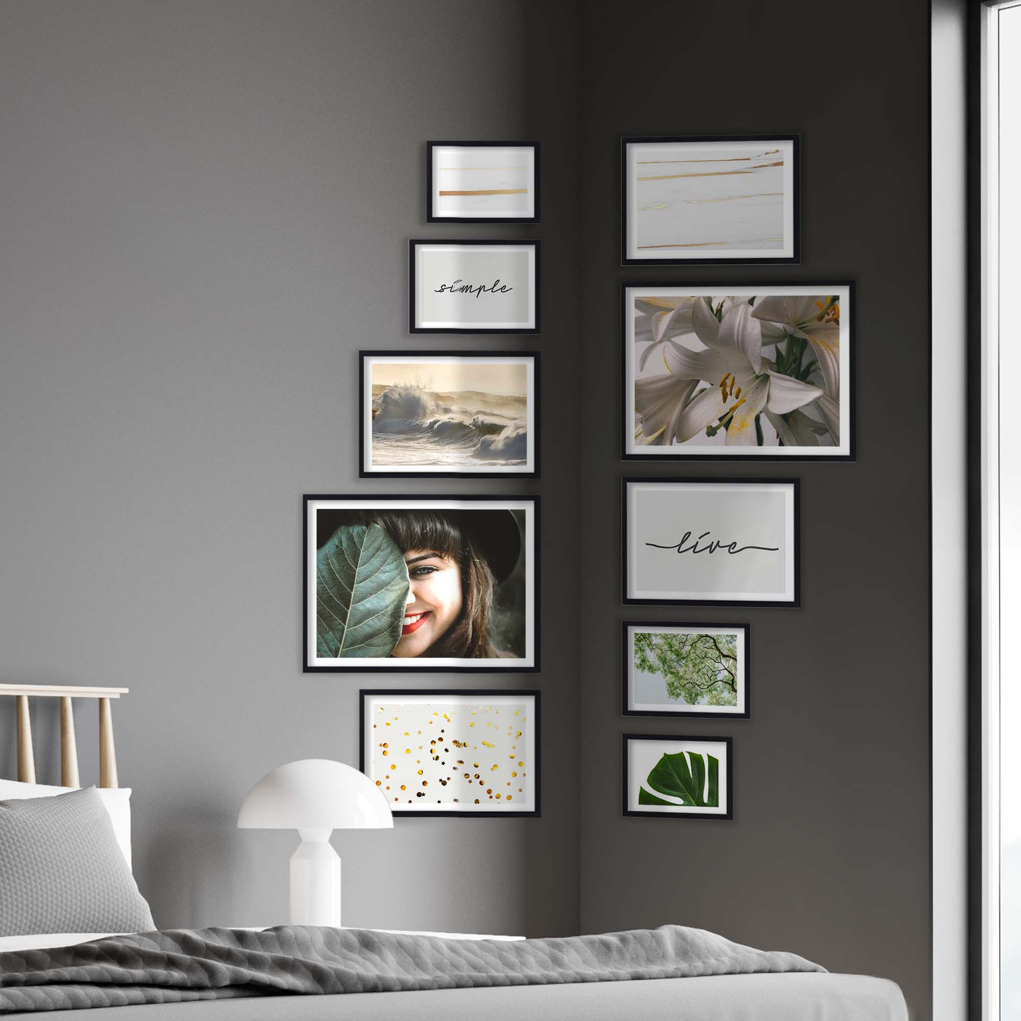 Nowoczesne galerie ścienne to prosty i efektowny sposób na aranżację każdego wnętrza. Dekoracyjny produkt pozwala stworzyć niebanalną kompozycję składającą się z 10 sztuk ramek. Wszystkie ramki zostały wykonane w 100% z drewna wysokiej jakości, dzięki czemu są trwałe i solidne.