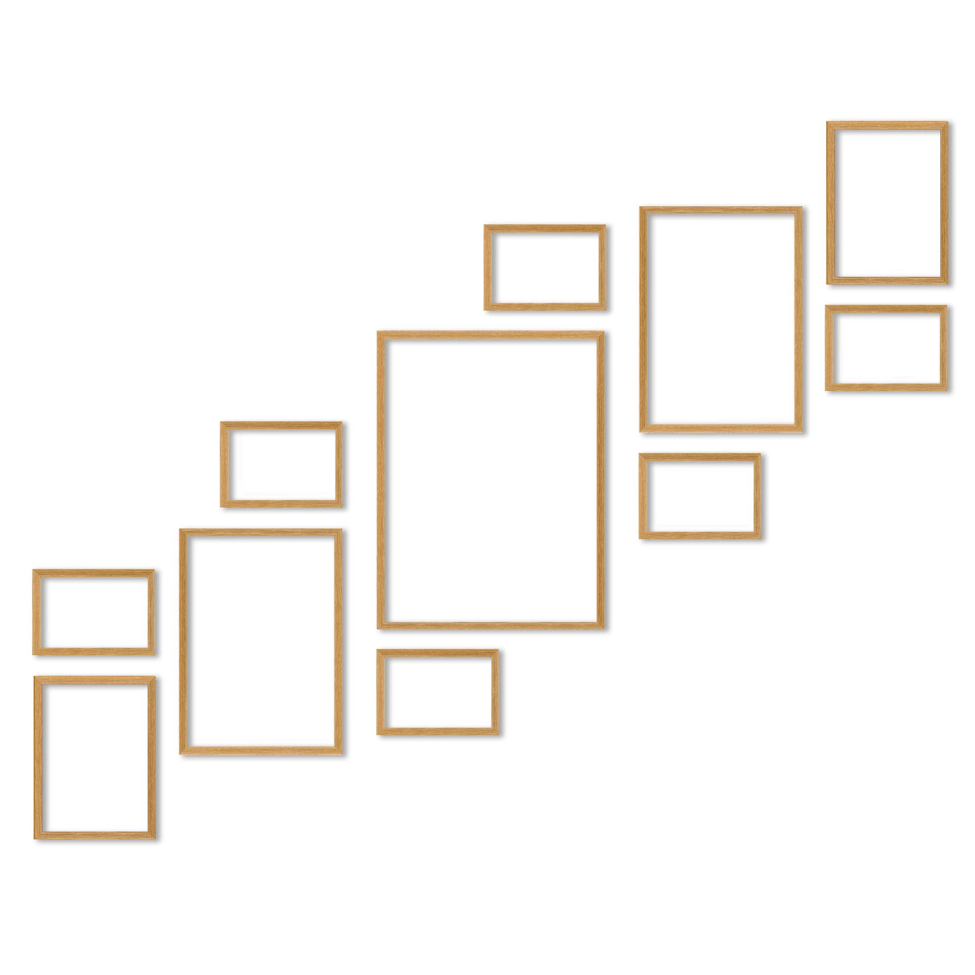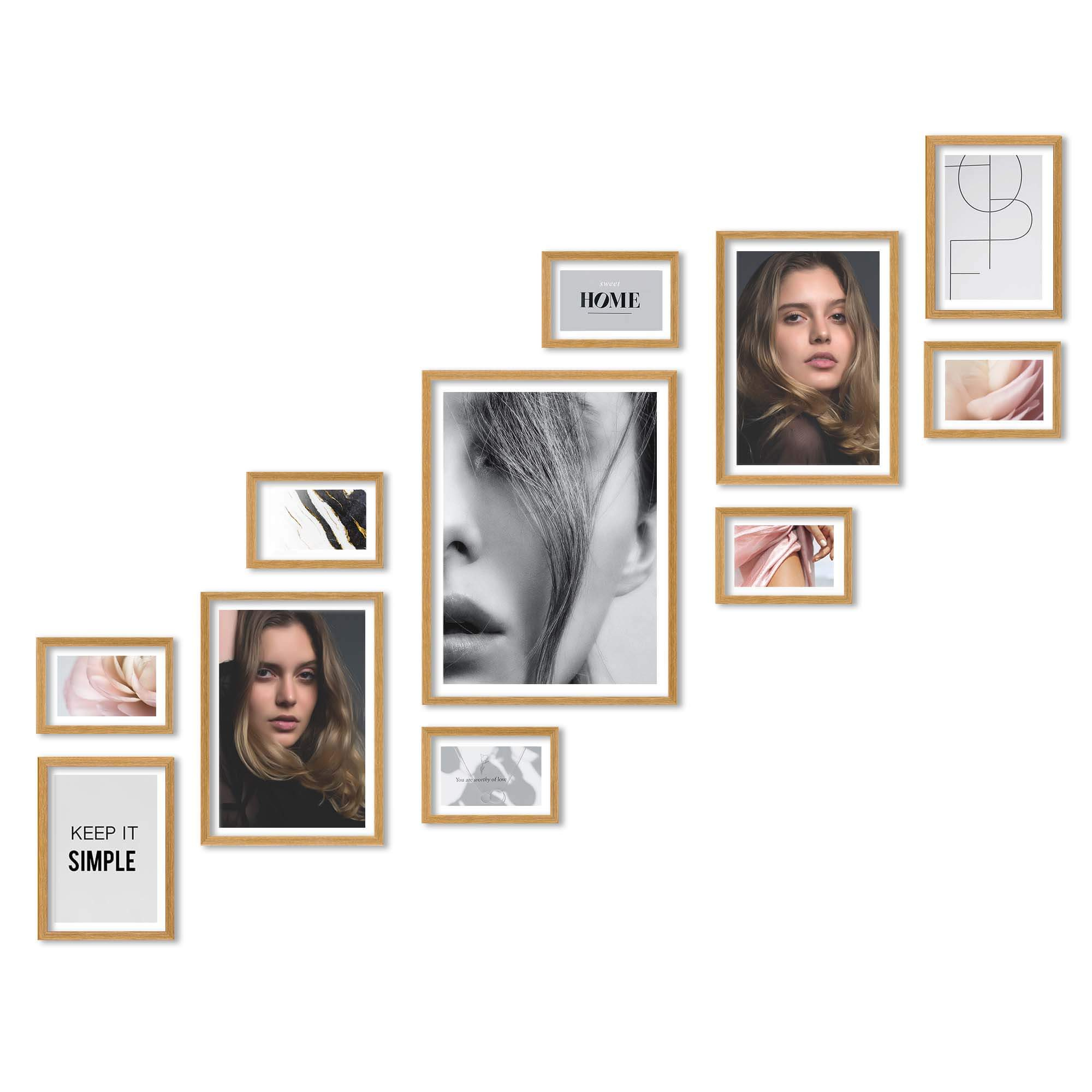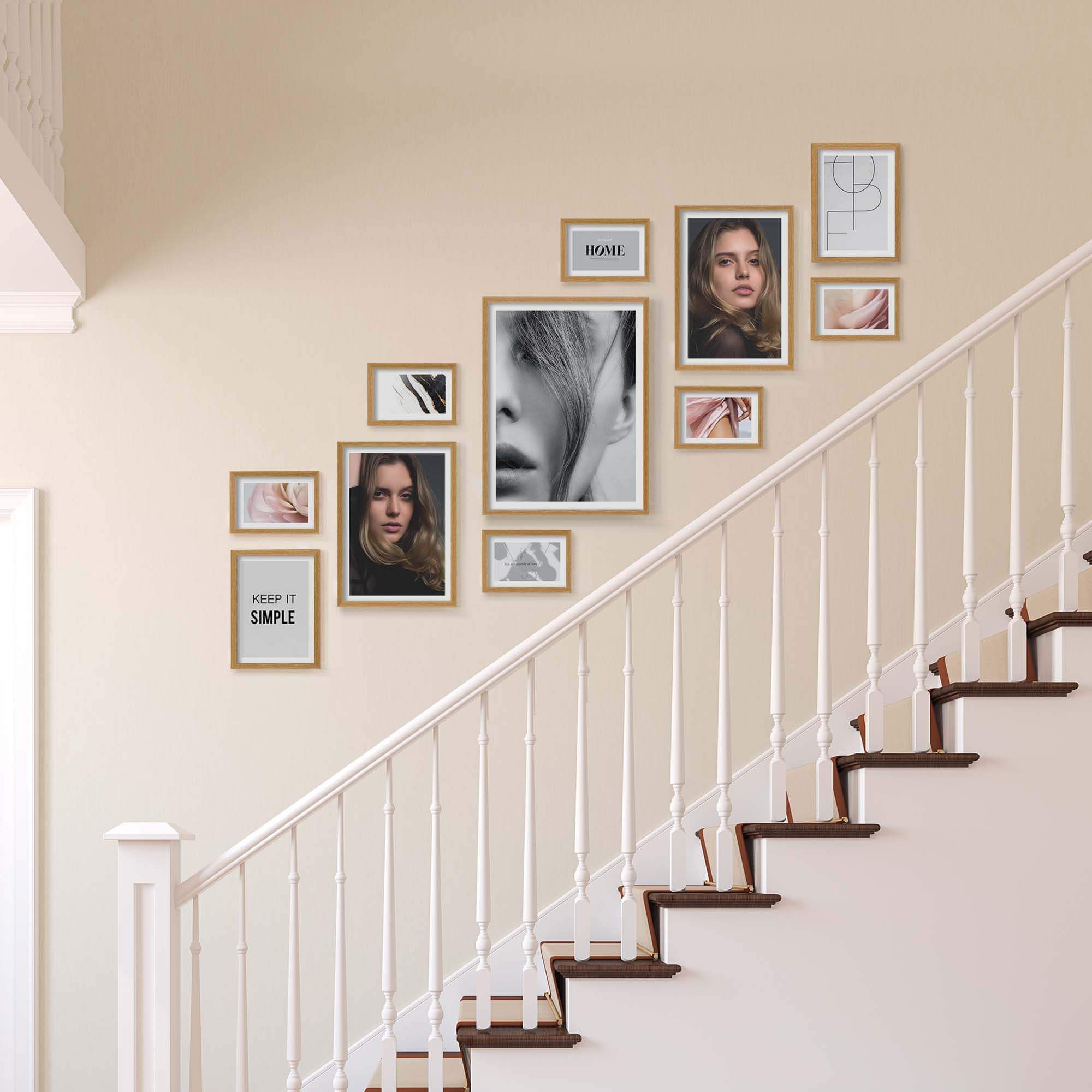 Nowoczesne galerie ścienne to prosty i efektowny sposób na aranżację ściany przy schodach. Dekoracyjny produkt pozwala stworzyć niebanalną kompozycję składającą się z 11 sztuk ramek. Wszystkie ramki zostały wykonane w 100% z drewna wysokiej jakości, dzięki czemu są trwałe i solidne.